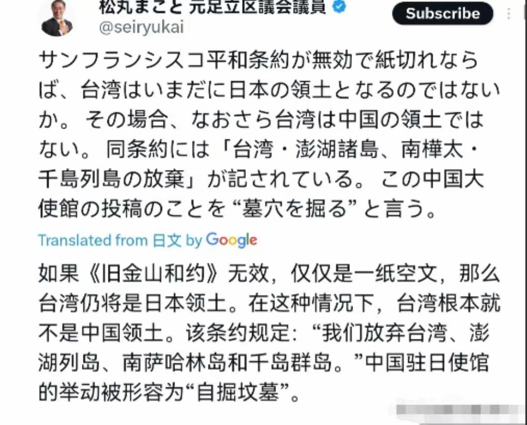 胆儿越来越肥,日本一丝一毫也没有惧怕中国!日本前议员松丸诚狂言:中国若不接受《旧金山和约》,那台湾就是日本“领土”! 日本明知道《旧金山和约》是在没有中国参加的情况下,由美国主持召开的,明知道这个《和约》规定台湾主权未定,明知道一提《和约》中国就气愤。日本就偏偏拿《合约》说事。 日本有胆量那就派兵到台湾驻守呀,还是没胆量!我们要“宜将剩勇追穷寇”,现在中国已经没有回头路,只有继续加大反击日本的力度,这次不打服他,以后就没机会了! 日本对华态度 中方对日本态度 日本对美态度 日本历史欠账