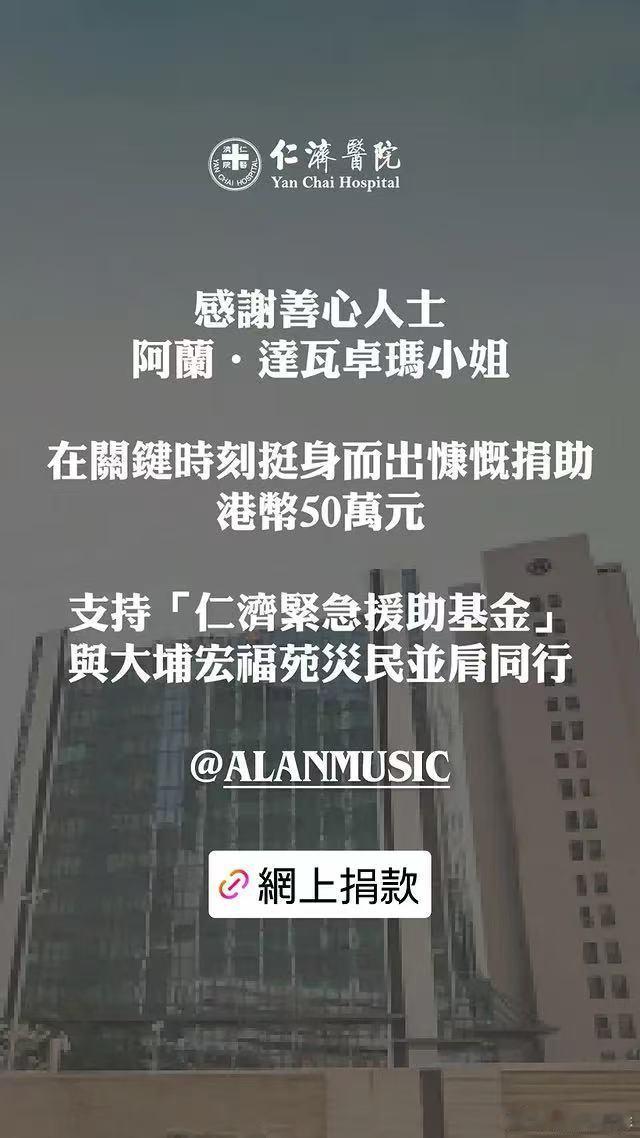 阿兰向香港捐款50万元 有在持续关注香港灾情,看到阿兰也捐了款。愿香港早日恢复平静,也愿所有像阿兰一样默默行善的人,都有好的回报!。