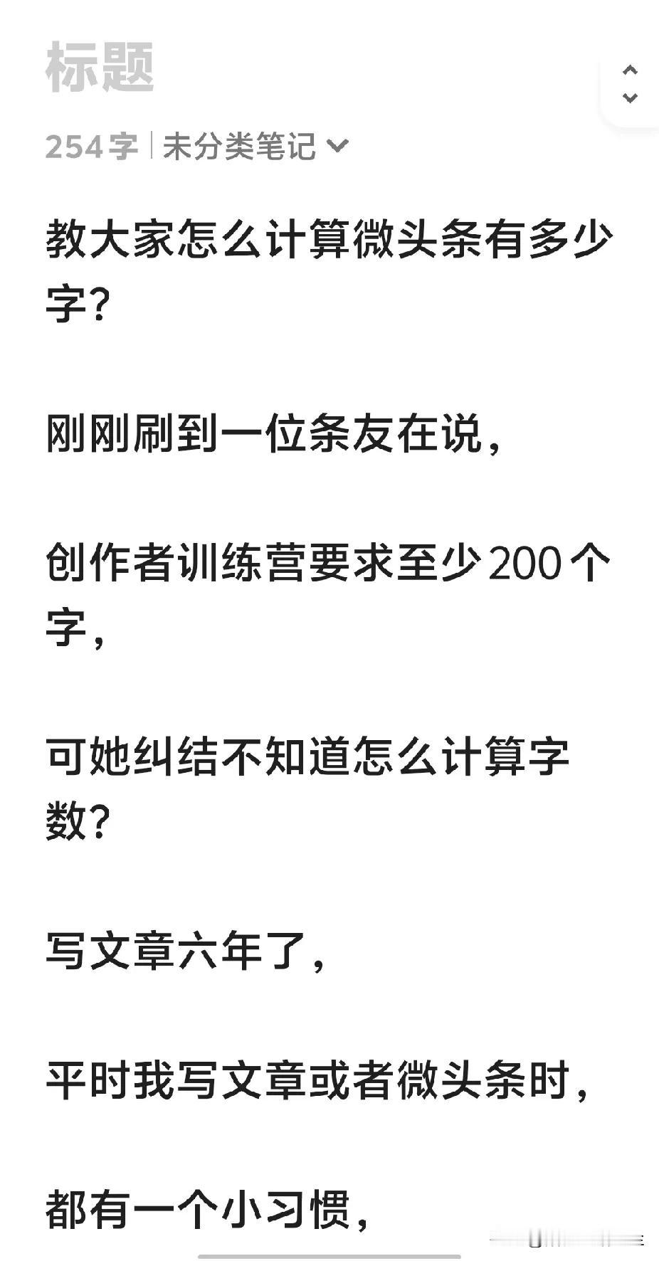 怎么计算文章、微头条写了多少字? 刚刚刷到一位条友在说, 创作者训练营要求至少200个字, 可她纠结不知道怎么计算字数? 写文章六年了, 平时我写文章或者微头条时, 都有一个小习惯, 是用的手机备忘录来写, 这样就可以知道写了多少字? 当然,你还可以用发文章的方式来计算字数。 说真的,以前我也不参加任何活动, 前年、去年随便爆火一篇文章, 至少收益上千块。 而如今,我等却只能看着“素某三”之流辈,数钱数得手软了! 写热门话题,似乎已经成了过去, 头条里卧虎藏龙, 稍有不慎就会踩中“地雷”。 说不定哪天就让你的账号“背井离乡”了! 还是每天求个“上上签”, 先“保命要紧”吧!