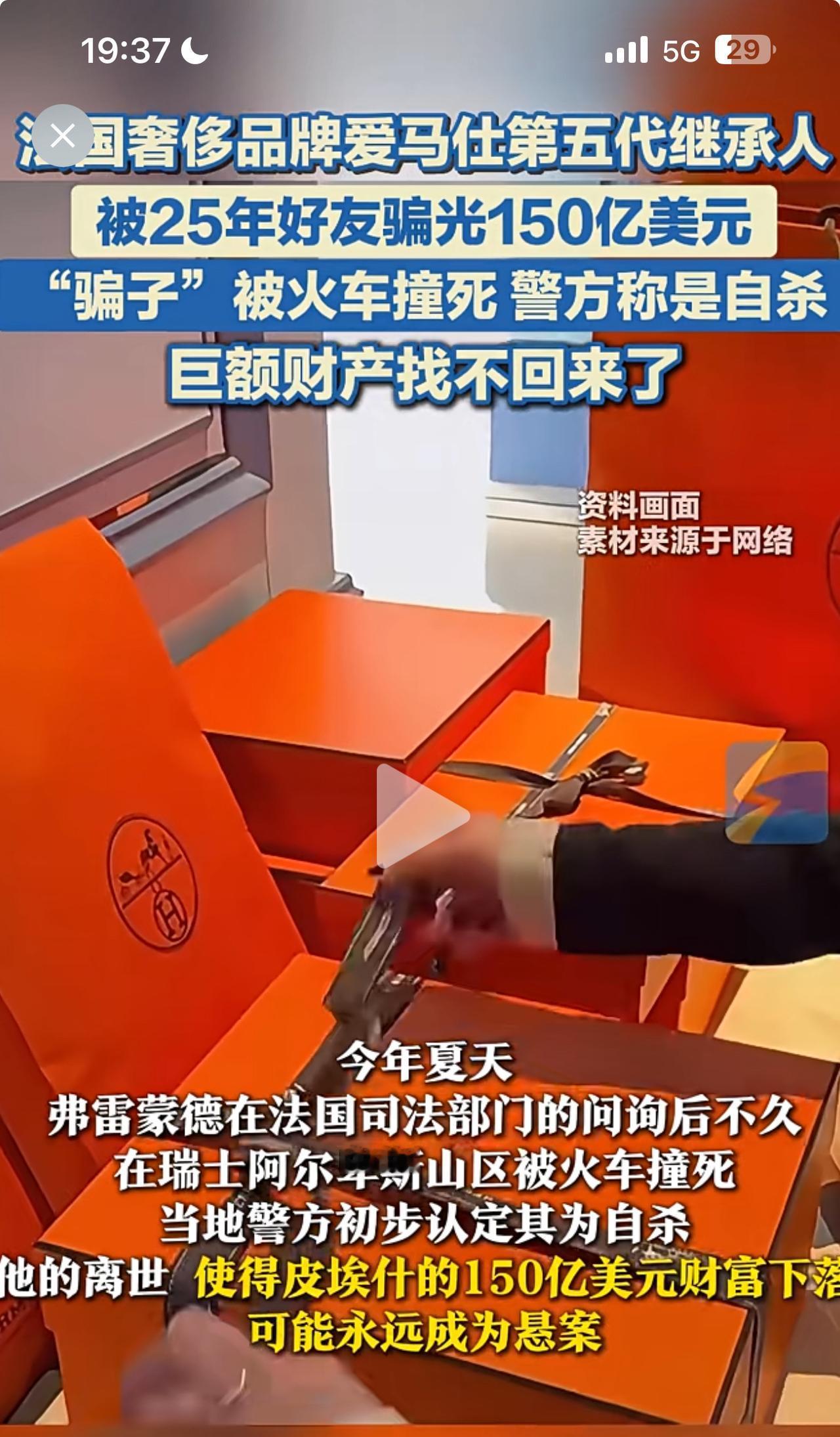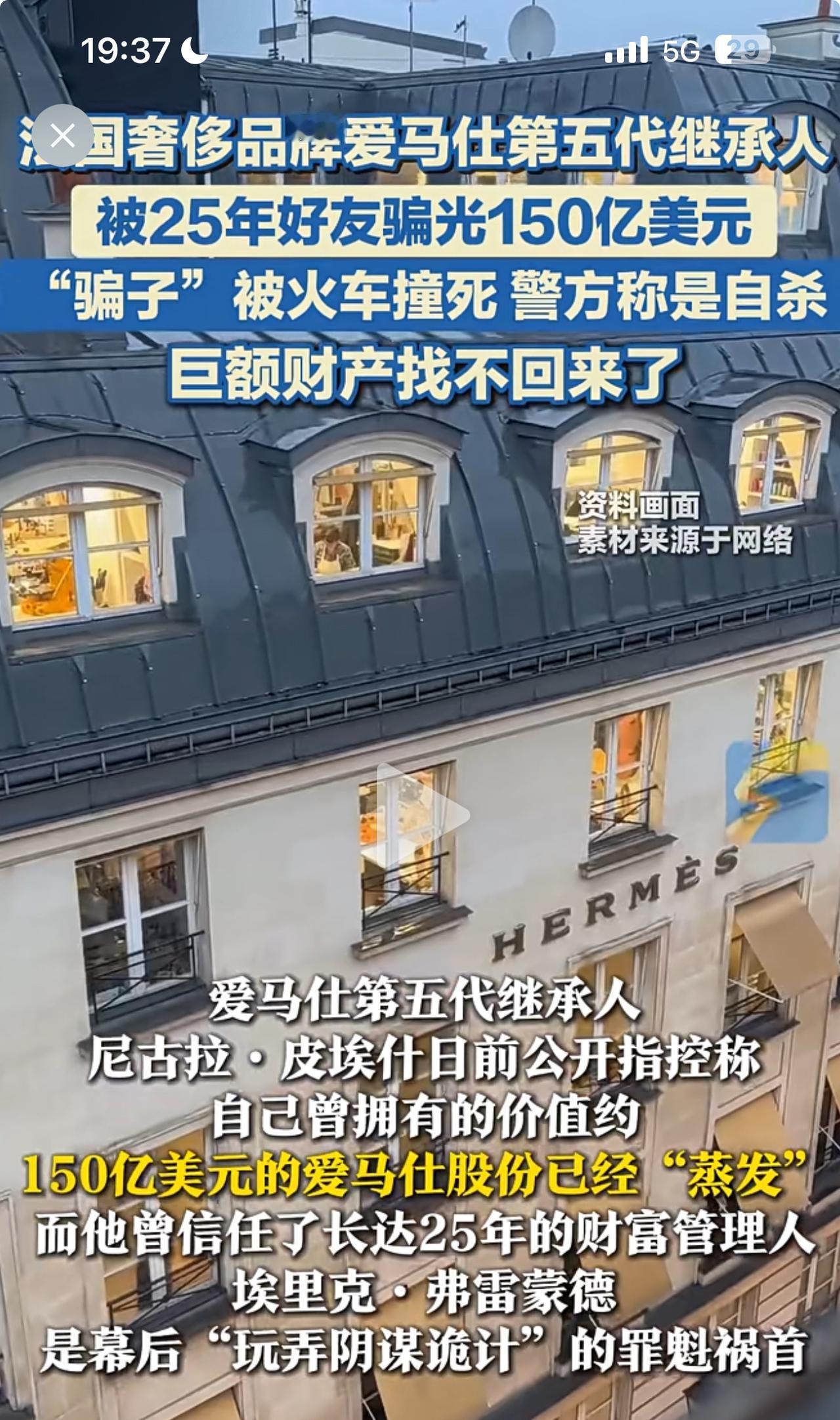 天唉!爱马仕老板150美元被“偷”了! 金山银山,万贯家财,谁不羡慕?如果没有守住钱袋子,那也就是竹篮打水。 据说,最近这个最倒霉的人就是爱马仕的第五代继承人,尼古拉·皮埃什! 爱马仕这个奢侈品品牌,每年赚取的利润那是上亿的收入。老板就把钱交给自己的好友埃里克·弗雷蒙德打理,多年来管理资金高达150亿美元。 老板也本着中国人的古训,用人不疑疑人不用,25年来从不怀疑自己的老朋友,谁知道最信任的人伤害他最深。 他的好友是个大骗子,25年来骗光他150亿美元!事情暴露后,这个好友兼骗子又在接受警方调查期间,被火车撞死了! 现在好了,这个关键的强盗死了!巨额资金去向成谜了!爱马仕的老板心都碎了。 警方说,嫌疑人是自杀。有这么简单吗?150亿美元被逐步转走,很显然不是他一个人的努力!他的任务完成了,他也被幕后老板灭口了…… 你们如何看呢?是不是团队作案?钱还能找回来吗?评论区里说一说。