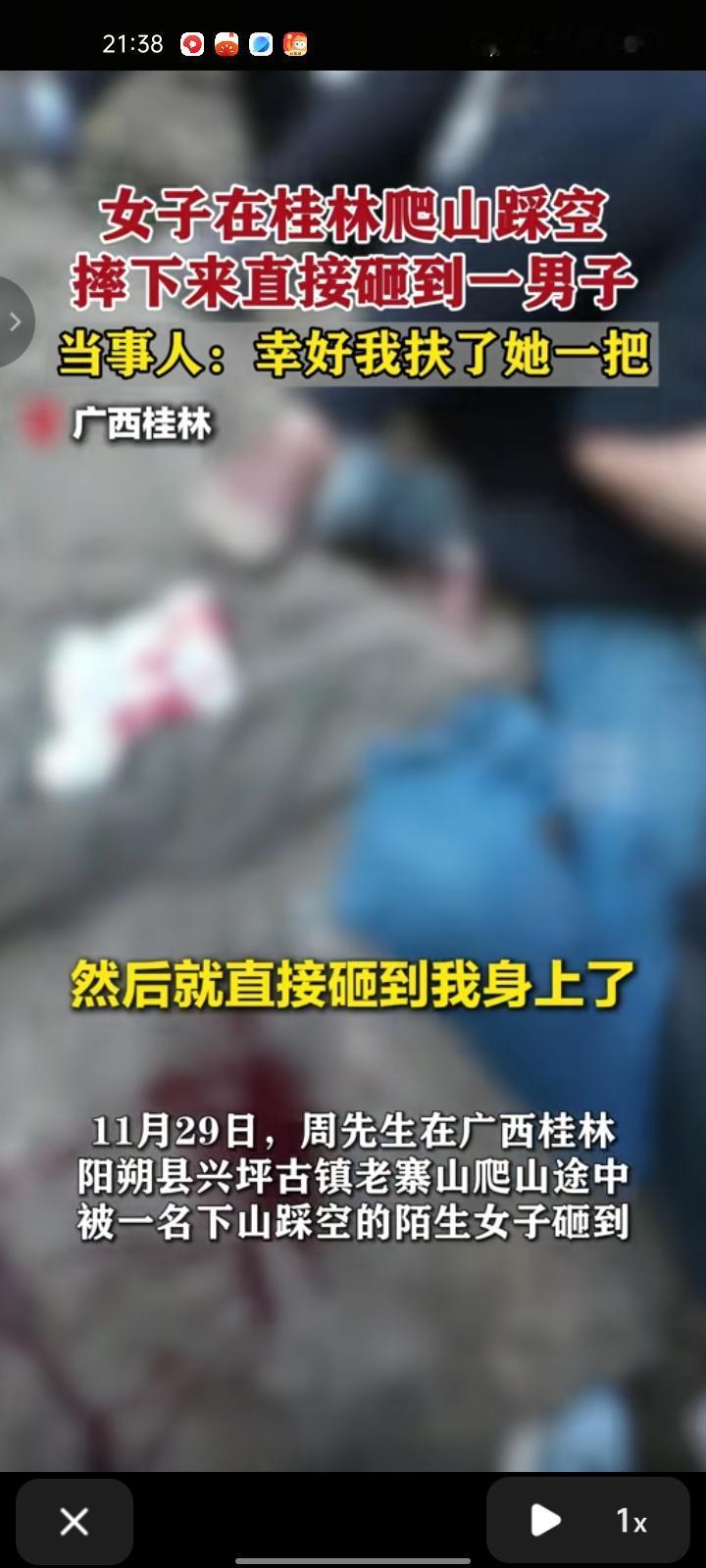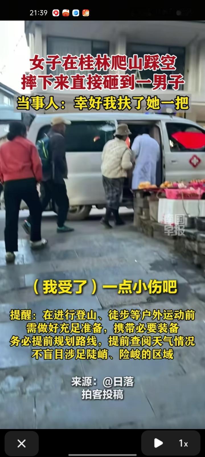 11月29日,桂林市阳朔县。周先生爬老寨山途中,被一位下山踩空的陌生女子砸到,幸亏他扶了一把,要是没有扶,两人直接摔倒山下了。陌生女子受伤出血,下山坐救护车离开了,周先生也受一点小伤。 这件事提醒大家,进行登山、徒步等户外活动钱,需做好充足准备。携带必要装备,务必提前规划好路线,提前查阅天气情况,不盲目涉足陡峭、险峻的区域