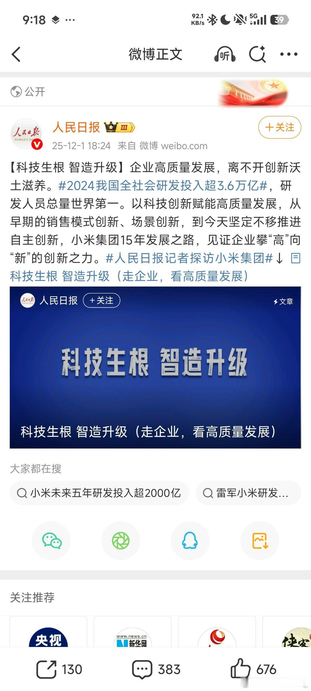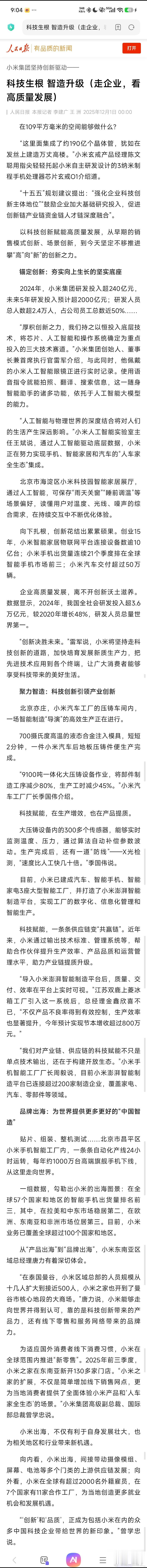 人民日报谈小米集团高质量发展在很长时间里我一直觉得对小米最极端的攻击点是:组装厂。这个攻击的恶毒之处在于:它既否认了现代工业体系分工细致明确的基本性质,又否认了小米对技术长期以来不断加码背后的追求。人民日报今天的博文就从实处肯定了小米这两年的研发产出。小米玄戒O1,中国大陆第一款3nm旗舰移动SoC,在小小的109平方毫米空间里集成了约190亿个晶体管,成为小米这两年研发投入最重磅的阶段性成果。这样的成果对这两年的小米来说可谓井喷,除开玄戒O1外,小米还造出了破中国新能源记录的现象级轿车SU7和SUV YU7。在这之后的则是小米这两年巨额的研发投入。仅2024年,小米集团研发投入就超240亿元,今年则是预计超300亿元,未来5年研发投入预计超2000亿元;研发人员总人数超2.4万人,占公司员工总数近50%……,随着投入的加码,研发人员团队也得到了进一步扩充。从《麻省理工科技评论》亚太“35岁以下科技创新35人”的陈龙到前 DeepSeek研究员罗福莉,小米现在吸引到了足够多的行业人才来充实自己的战略方向,从人车家全生态到AI战略,小米现在是可以大胆地说自己:“有钱、有人、有决心”。研发投入和人才吸引的背后,小米构建了一套基于中国工业体系优势又反哺带动国产成长的高效正向循环系统。小米自研的澎湃智能制造平台,连接了超过200家制造企业,通过赋能把供应链干成了“共赢链”。小米SU7U prototype和标准版在纽北跑出最佳成绩也让中国智造带向全球,小米在汽车爱好者心目中已经不是那个只做手机的厂商而是“创新”和“品质”的代名词,小米成为了中国品牌在全球的新印象。这在充斥着傲慢与偏见的洋人刻板印象圈子里是难以想象的巨大突破。现在我再问你,你看懂了人民日报这次头版头条的含金量了吗?你们真的还要继续用“组装厂”来黑小米吗?