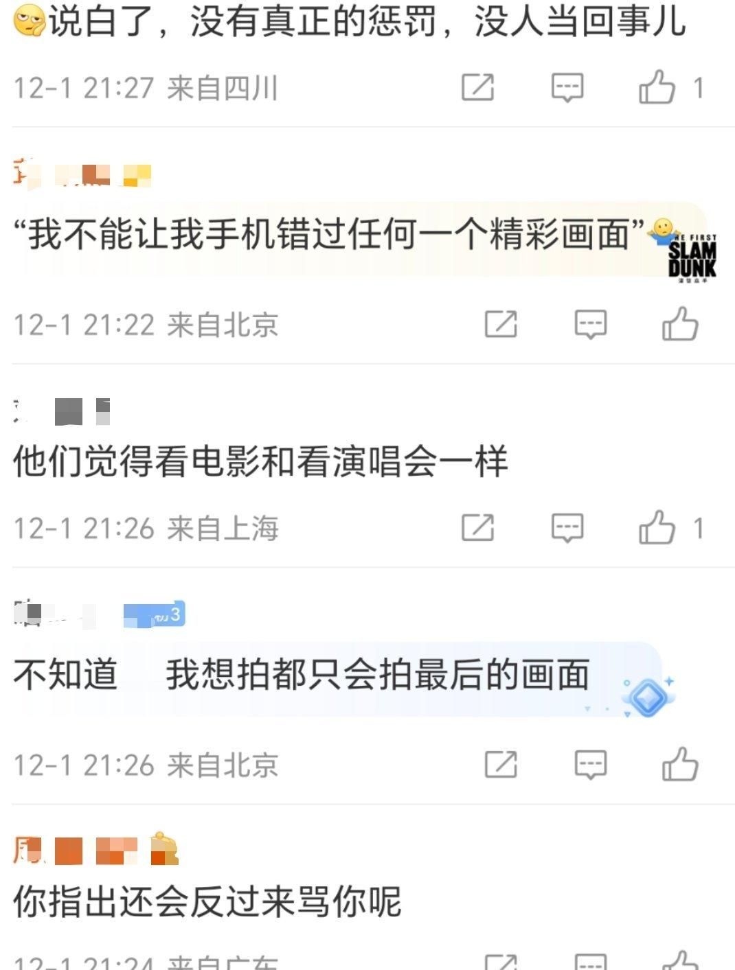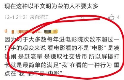 看电影圈kol又在大力谴责摄屏如何如何不道德,以前我没咋想过这事,就被动接受不能摄屏。真正细想一下,在不影响他人的情况下普通观众拍几张图又怎么罪大恶极了?看演唱会拍几个视频照片会被说不道德么?看剧截几个图发片段又会被说特别不文明像随地大小便么?看电影不就是种娱乐方式,想分享打卡搞社交凑热闹又怎么了,这难道不是最基础的人之常情?那么多娱乐方式就电影最高贵不能被玷污娱乐化 明明电影为了宣传各大平台都放各种片段,观众花了钱拍几张图发出来就要被各种谴责,很搞笑图2划圈的评论最典型,自己把看电影当做朝圣,花钱凑热闹的观众不是在看电影是在“玷污” 嫌弃这种观众俗不配看电影,有本事让电影院出公告啊,说不欢迎摄屏的人,一旦被发现摄屏就罚款100甚至1000,我支持啊,别到时候各种导演制片演员又泪洒现场求排片求着大众去看🙄 如果是觉得摄屏光线影响其他观众,那现在看电影有多少人忍得住全程不玩手机看手机屏幕光线甚至比拍照录音时光线更强时间更长更影响周围人观影,但电影圈kol可不敢说看电影不能玩手机说一看手机就是不文明行为,因为一说就会被反过来攻击那是因为电影太无聊才玩手机😂