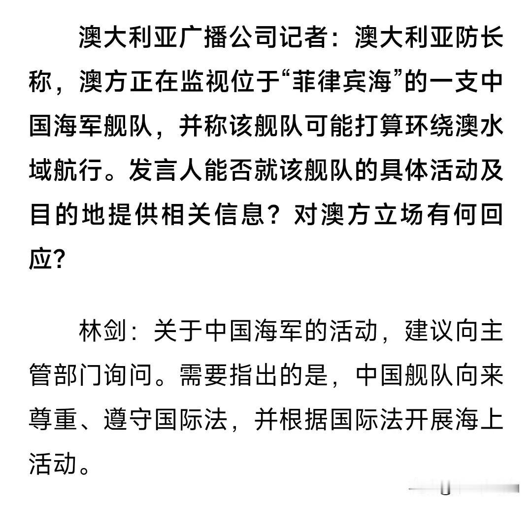 今天(12月1日),外交部例行记者会上的一幕。 🇦🇺澳大利亚广播公司记者:澳大利亚防长称,澳方正在监视位于“菲律宾海”的一支中国海军舰队,并称该舰队可能打算环绕澳水域航行。发言人能否就该舰队的具体活动及目的地提供相关信息?对澳方立场有何回应? 🇨🇳中国外交部发言人林剑:“关于中国海军的活动,建议向主管部门询问。需要指出的是,中国舰队向来尊重、遵守国际法,并根据国际法开展海上活动。” 评5句 1. 澳大利亚这通“海上狗仔队”操作,镜头比军舰还多,戏精程度直逼好莱坞。 2. 自家军舰跑别人家门口飙车喊“自由”,别人路过自家街口就报警,典型“村霸式导航”。 3. 一句“可能绕澳水域”翻译成人话:就是“还没来,我先哭,哭了就有预算”。 4. 真要在公海里查“威胁”,先把美澳联军在南海的打卡记录删干净,再谈“纯洁海洋”。 5. 中国海军只是按国际法正常航行,澳媒却急着加字幕、配阴乐——心虚的人,才总把别人当鬼。