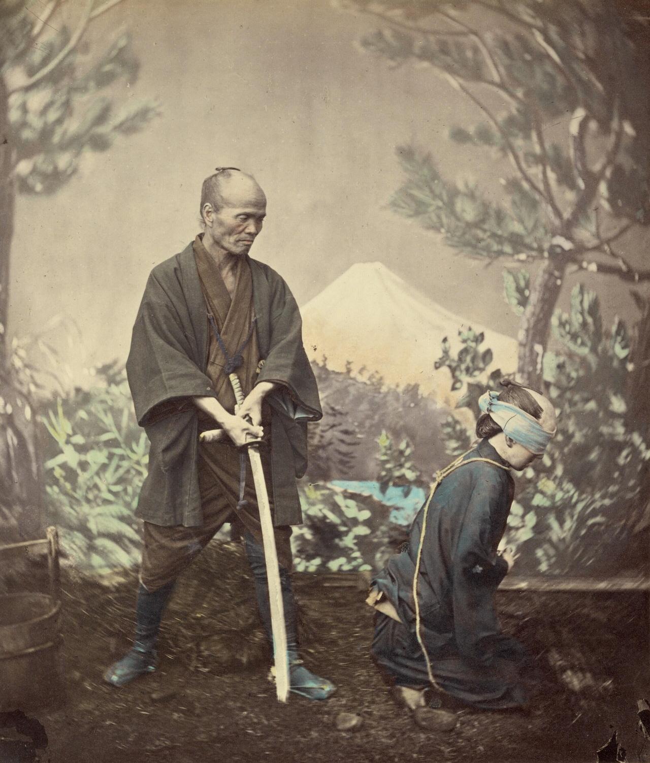 日本刽子手职业,照片里是个老手,一年能砍350个人,砍一个赚2.3美元。 这张19世纪的老照片,看得人后背发凉——江户时代末期的日本行刑场,跪着的犯人蒙着眼、脖子露在坑上方,持刀的刽子手正准备动手,背景里甚至还能看到富士山的轮廓。 这可不是演的,是真实的斩刑现场:犯人跪在小垫子上,脖子对着挖好的坑,刽子手一刀下去,人头直接掉进坑里,血顺着躯干往下淌。要是犯的罪重,脑袋还得挂在公共场所示众好几天。 照片里这场景离横滨没几公里,当年杀了外国军官的岛津诚一就是在这儿被处死的。这个刽子手的收入看着不少,可这职业在当时根本没人看得起。 以前只在影视剧里见的场面,老照片一摆出来,才真觉出那时候死刑的残酷。也难怪说“刽子手的刀,沾的是血,背的是骂名”,这行当赚的钱,全是拿人命堆出来的。
