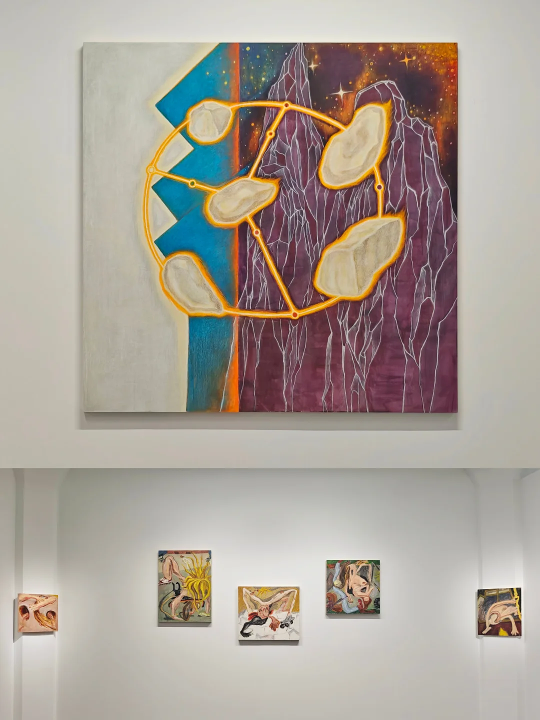 🖌️融合神秘符号、日常物品与变形身体,呈现多重身份与时间的交织,探索可见与不可见的边界。