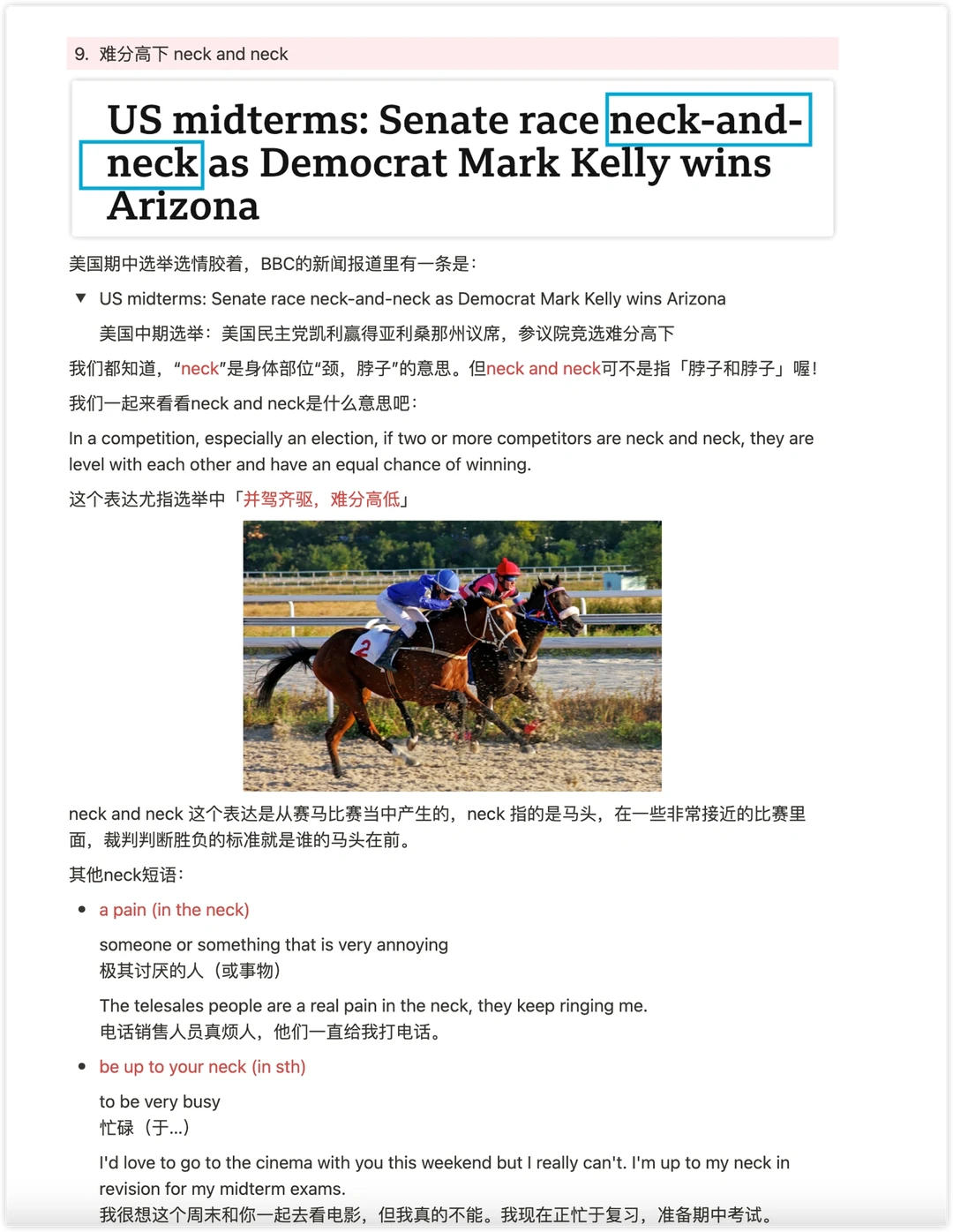 是从赛马比赛当中产生的,neck 指的是马头,在一些非常接近的比赛里面,裁判判断胜负的标准就是谁的马头在前。