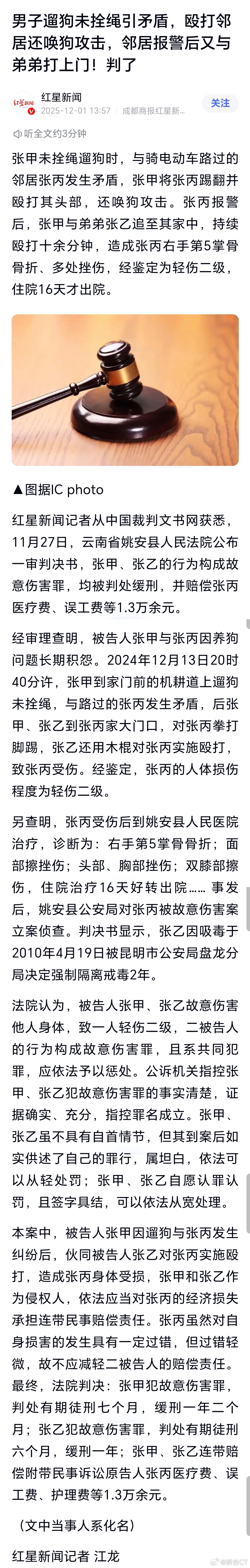 这个案子,我去裁判文书网上找了下对应文书。基本案情不复杂。2024年12月13日晚8时许,被告人甲因为遛狗没牵绳,和被害人产生冲突,后被告人甲和乙跑到被害人家门口,对被害人拳打脚踢,并有木棍殴打等行为,致使被害人轻伤二级。被告人甲说自己之所以会殴打被害人,是因为被害人想用电动车碾压狗,连他自己也差点被车撞倒,他气不过就把车踢翻了,后面又来到被害人家门口,与对方厮打。而被害人则表示,他压根就没有碾压狗的故意,差点撞到狗是因为天黑光线暗。这案子,最后以故意伤害罪追究两被告责任。其中一人被判有期徒刑7个月,缓刑1年2个月;另一人则被判有期徒刑6个月,缓刑1年。男子遛狗不牵绳还上门殴打邻居实务案例看一看