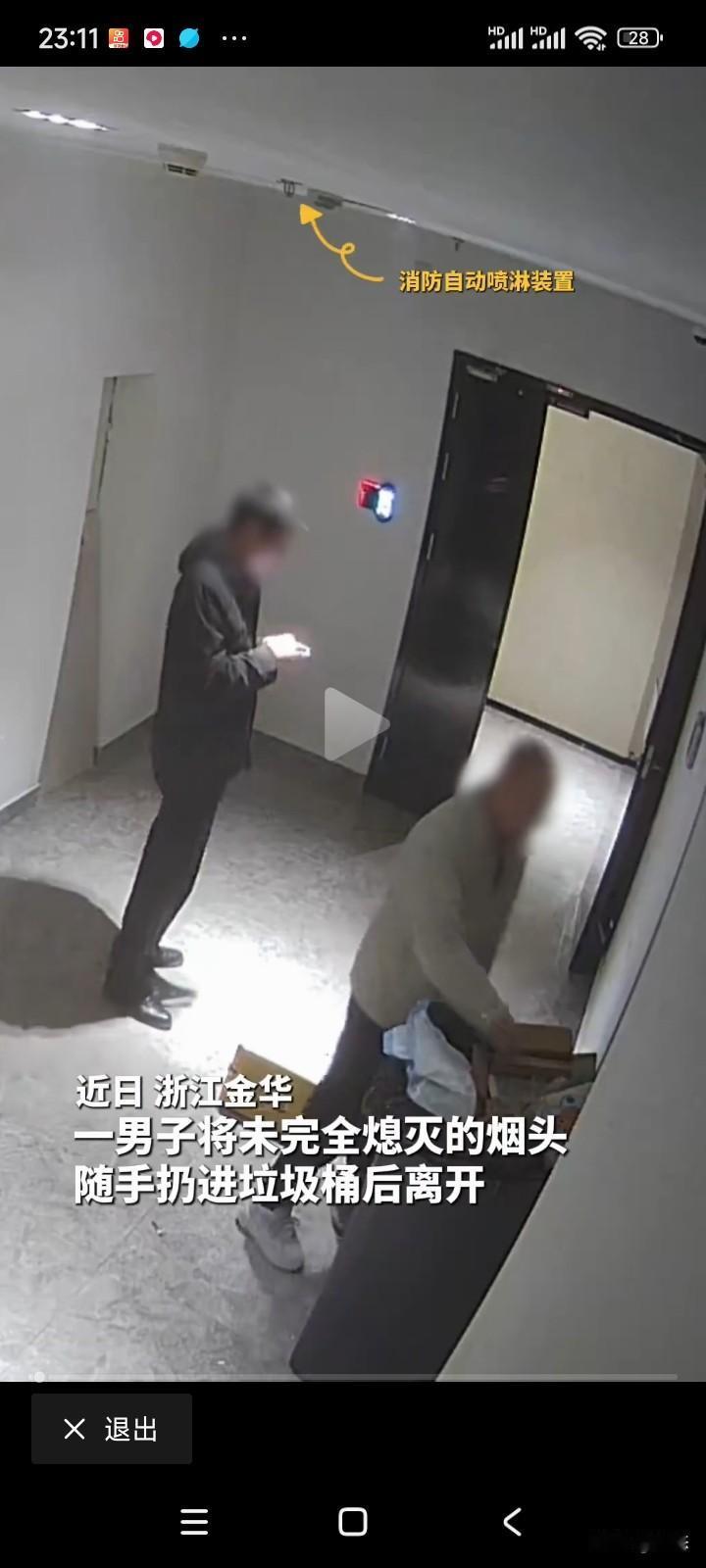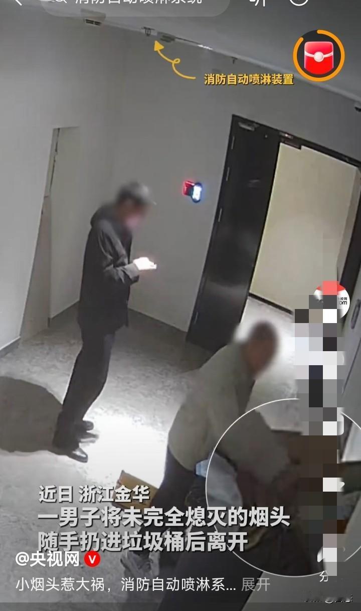 浙江金华一男子将未完全熄灭的烟头丢人垃圾桶,人离开后,没想到十分钟后 垃圾桶里面开始冒烟,随后起火。还好垃圾桶的顶部安装了喷淋装置,喷淋装置感应到高温自动喷水,很快就把火铺面了。 看到这,很多大火很可能就是小小的火星引发的,星星之火可以燎原。所以说大家一定要注意。 烟头一定要确认熄灭后在走,不然起火后果不堪设想啊! 希望大家引以为戒!