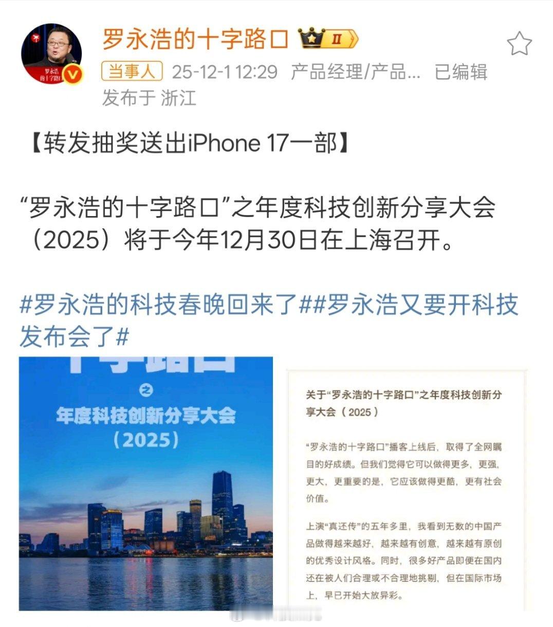 我的互关好友老罗宣布的大事:月底即将召开线下发布会!!!介绍大概十几个中国科技创新产品还有细红线科技自己研发和内部孵化的 AI软件真科技春晚了