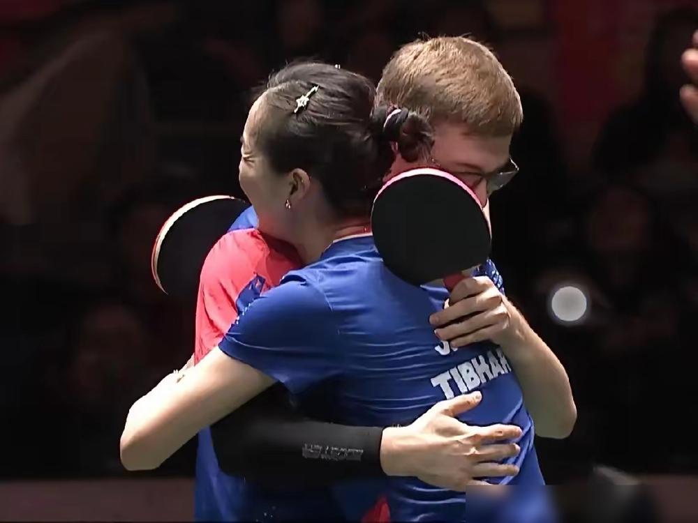 【40岁的华裔冠军袁嘉楠与艾利克斯·勒布伦激动相拥,庆祝胜利】他们2 - 1击败德国组合弗朗西斯卡/考夫蔓,获胜后袁嘉楠激动地拥抱了21岁的搭档艾利克斯。 ​ 这场拥抱背后,是年龄差19岁的组合用默契撕掉了所有标签。赢球那一刻,拥抱比奖牌更有分量。 ​ 混双赛场向来是战术博弈的棋盘。袁嘉楠的高抛发球像一把软刀子,弧度刁钻落点诡异,让对手接得别扭。勒布伦的爆冲则是硬碰硬,年轻气盛全写在板子上。一柔一刚,偏偏打出了节奏差。德国队第二局专攻袁嘉楠的反手位,明摆着欺负老将移动慢。但第三局法国队变招了,勒布伦主动补位到中线,袁嘉楠侧身让出进攻角度。这哪是临时调整,根本是平时喂了千百个球练出的信任。 ​ 看看数据更明白。袁嘉楠今年横扫过早田希娜、平野美宇,40岁还能保持世界前二十的排名。勒布伦兄弟这两年横空出世,哥哥艾利克斯今年世乒赛差点掀翻樊振东。两人搭档混双时间不长,但华裔老将的沉稳和欧洲新星的野性,意外地化学反应十足。 ​ 德国队没上波尔奥恰洛夫,看似留了后手,实则暴露了梯队隐患。弗朗西斯卡双打能力不差,可带着年轻搭档考夫蔓,关键分明显手软。10平后那两个球,德国队连续拉丢半高球,而法国组合敢用正手搏杀。经验差距在赛点上放大成鸿沟。 ​ 虽然法国队最终大比分输给德国,但这场混双胜利像颗火种。老将不死,新星不骄,乒乓球从来不是单打独斗的游戏。勒布伦赛后采访说“楠姐教我控制节奏”,袁嘉楠笑着接话“他让我想起二十岁的自己”。这种传承比胜负更珍贵。 ​ 体育精神最动人的地方,就是让年龄、资历、背景的差异,在共同拼搏中化为乌有。球台两侧是对手,击掌之时见格局。 ​