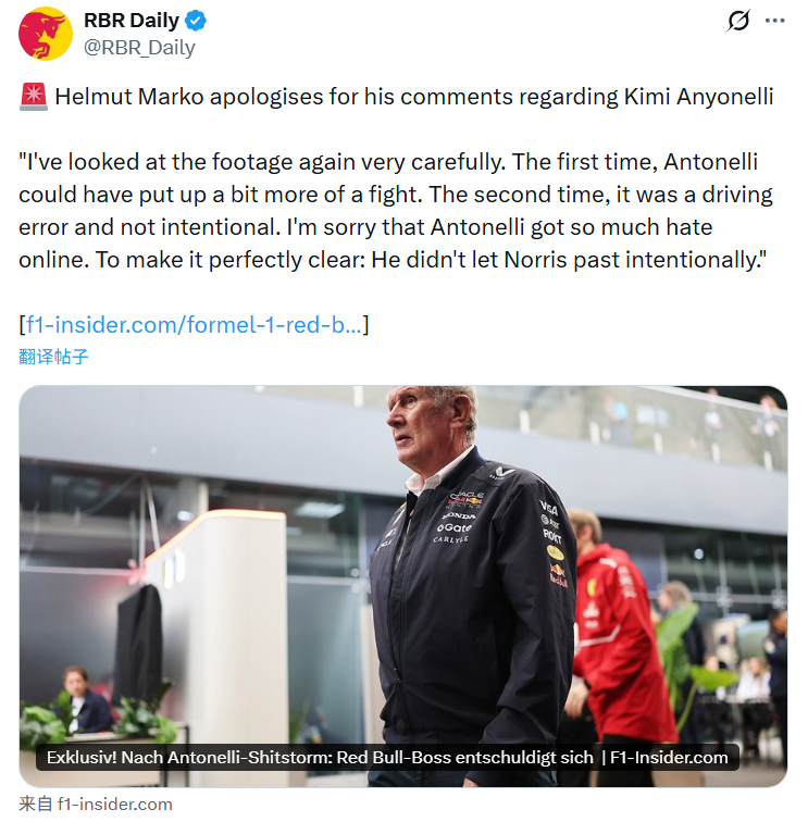 红牛顾问马尔科向安东内利致歉:“我仔细再看了一遍录像。第一次,安东内利可以多做一些抵抗;第二次,这是一个驾驶失误,不是故意的。我很抱歉安东内利在网上招受了这么多的恶意。说得再清楚一点:他没有故意让诺里斯完成超越。”2025f1卡塔尔大奖赛