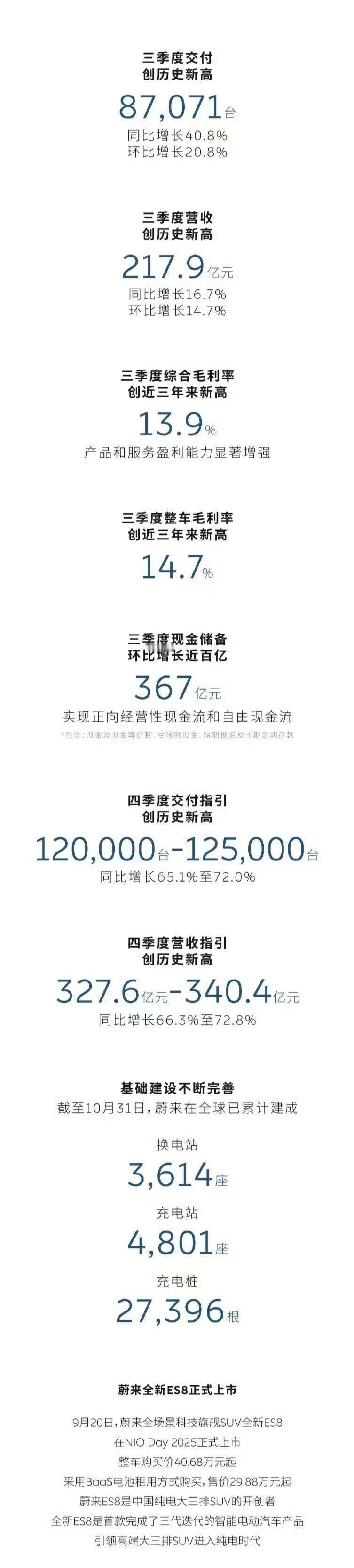 蔚来今年Q3财报来了,说重点:营收 217.9 亿元,创历史新高;调整后净亏损为27.35亿元,同比和环比均大幅下降;Q4交付指引12万至12.5万台。斌哥喊了很久Q4要盈利,目前来看还是挺有挑战性的,大家觉得能不能成?