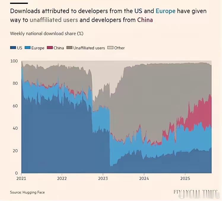 三大AI关键技术,中国终于2:1领先美国!英国《金融时报》披露中国开源AI模型全球下载份额首超美国,相当于一个标志性的技术拐点正式到来!麻省理工学院与Hugging Face的联合研究显示,中国团队开发的开源AI模型下载量占比达17%,首次超越美国的15.8%,登顶全球第一 。在AI核心竞争的三大关键领域,芯片、算法、应用,中国已实现算法与应用双领先美国2:1格局,加上芯片算力也通过集群模式反超,彻底改写了过去美国主导的全球AI技术版图。1,算法开源逆袭,打破闭源垄断,而且效果更好。AI竞争的核心战场之一在算法,而中国正以开源模式实现对美国闭源路线的降维打击。过去,美国凭借OpenAI的闭源模型占据算法话语权,但随着DeepSeek、通义千问等中国开源模型的大规模落地,这一优势已被彻底颠覆。DeepSeek最新推出的数学推理模型DeepSeek-Math-V2,在国际数学奥林匹克竞赛中斩获金牌,更在普特南数学竞赛中取得近乎满分的成绩,以实打实的技术突破领跑全球。中国开源模型的崛起并非单点突破,而是形成了生态级优势,全球正快速使用,包括美国硅谷大量企业也用DeepSeek等中国模型,效果差不多、成本却低一大截。这种“开放共享+全球协作”的模式,让中国算法快速积累真实场景数据迭代优化,构建起全球开发者参与的技术生态,相比美国闭源模型“闭门造车”的商业逻辑,更具生态可持续性与技术扩散力,最终实现了全球市场份额的反超。2,应用中国天然领先,AI产业赋能轰轰烈烈开启,拉开代际差距。美国AI应用停留在信息服务和软件开发等软服务层面,中国则已将AI深度植入实体经济,形成了难以逾越的应用优势。美国AI多集中于信息归纳、智能助手等轻量场景,而中国“人工智能+”已全面渗透制造业、医疗、能源等关键领域,实现了从实验室到生产线的高效转化,而且在服务业也用得很快。比如在制造业,三一公司通过自主研发的“数字元平台”,实现生产全流程智能化监控,产品缺陷减少20%,交付时间缩短30%以上;大庆油田的智能巡检机器人24小时不间断作业,跑冒滴漏识别准确率达100%,彻底替代传统人工巡检 。在商业服务与公共领域,“桂林版昇腾DeepSeek”大模型落地后,已广泛应用于政务服务、医疗、文旅等场景,为千行百业提供智能化解决方案 。这种与产业深度绑定的应用模式,既为AI技术提供了海量真实数据反哺迭代,又创造了巨大的产业价值,让中国AI应用形成了应用和再优化的良性循环,与美国的应用场景差距持续拉大。3,芯片通过集群突围,破解算力瓶颈,美国人卡不住了。芯片作为AI的算力底座,曾是中国的短板,美国人也不断卡脖子。但通过集群技术创新,算力上中国已实现对传统芯片巨头的弯道超车。以华为昇腾为代表的国产芯片,不再局限于单一芯片性能比拼,而是通过集群架构整合算力,形成了规模化算力优势,其整体算力输出已超越英伟达同类产品。 这种集群化思路有效破解了芯片制造工艺的限制,通过多芯片协同工作,满足了大模型训练、超算任务等高强度算力需求。很多地方,不仅仅中国、甚至亚非拉国家通过部署的昇腾+DeepSeek全中国国产业链,实现了本地数据调用、联网推理分析等复杂功能,证明了国产算力底座的可靠性与高性能 。为AI技术持续突破提供了坚实保障,彻底摆脱了对美国芯片的依赖。4、人才梯队成型,中国必将巩固领先优势技术竞争的根本是人才竞争,中国AI人才梯队的快速崛起,为领先优势提供了长效保障。全球AI人才中美两国占据超50%份额,其中中国AI研究人员达5.2万人,以28.7%的年复合增长率快速追赶,且在全球Top100 AI人才榜单中,中国机构学者占比达55%,远超美国的20% 。当然部分中国专家目前是为美国企业服务,但是中国高校培养速度非常快。中国已形成高校和企业的双轮驱动人才培养模式。中国科学院、清华大学等高校构成人才培养第一梯队;华为、腾讯、阿里、字节等企业研发团队规模已超越部分高校。庞大的人才储备与完善的培养体系,让中国AI技术创新具备了持续动力,未来将进一步巩固算法与应用的领先优势,推动芯片技术实现更大突破。随着开源生态持续扩大、产业应用不断深化,中国AI的领先优势将进一步固化。算法这一突破不仅改写了全球AI竞争格局,也让中国有了从技术跟跑到规则制定的转型底气,最终在全球科技竞争中占据核心话语权。