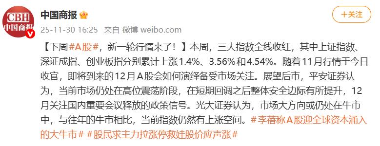 中国股市已到关键时刻!2025年11月30日,《中国商报》:下周A股,新行情来了!一些不公平制度必须尽快改变! 在历经多年的发展后,我国股市已经逐渐形成了多层次的体系。越来越多的人接触到了股市,并且进行了投资。随着投资者越来越多,国内股市受到的关注也越来越多。就在近期,股市再度传来一则消息! 2025年11月30日,据《中国商报》报道。在接下来一周,A股迎来了新一轮的行情。上证指数,深证指数,创业板指分别累计上涨1.4%,3.56%和4.54%。 而之所以会出现这一情况,跟国家经济得到稳定增长有关。据了解,在2025年,我国的经济增长预计能够高达5%。而到2026年的时候,大概率还能够得到延续。 加上越来越多的企业走出了国门,并且涉及到的领域越来越广泛,所以国内的股市也能够迎来一次蓬勃的发展。 正因此,反映出来国内股市存在的一些问题!例如目前国内股市存在的资金供需失衡的情况,而且在a股中个人投资者的占比较高,一些专业的投资者影响力并不高。 相对于前者,后者应该格外关注。如果想要让中国的股市获得更多的国际关注,就应该提高一些专业机构投资者的影响,从而去形成一个良好的投资结构。 当然除了这些之外,股市还存在着一些其他方面的问题。随着中国股市发展越来越蓬勃,中国股市已经走到了一个关键时刻。所以在这种情况下,一些问题必须要及时进行改变,从而让市场形成一个良性的发展。 对此,您怎么看?欢迎评论区留言您的看法。 (信息来源:中国商报-20251130)