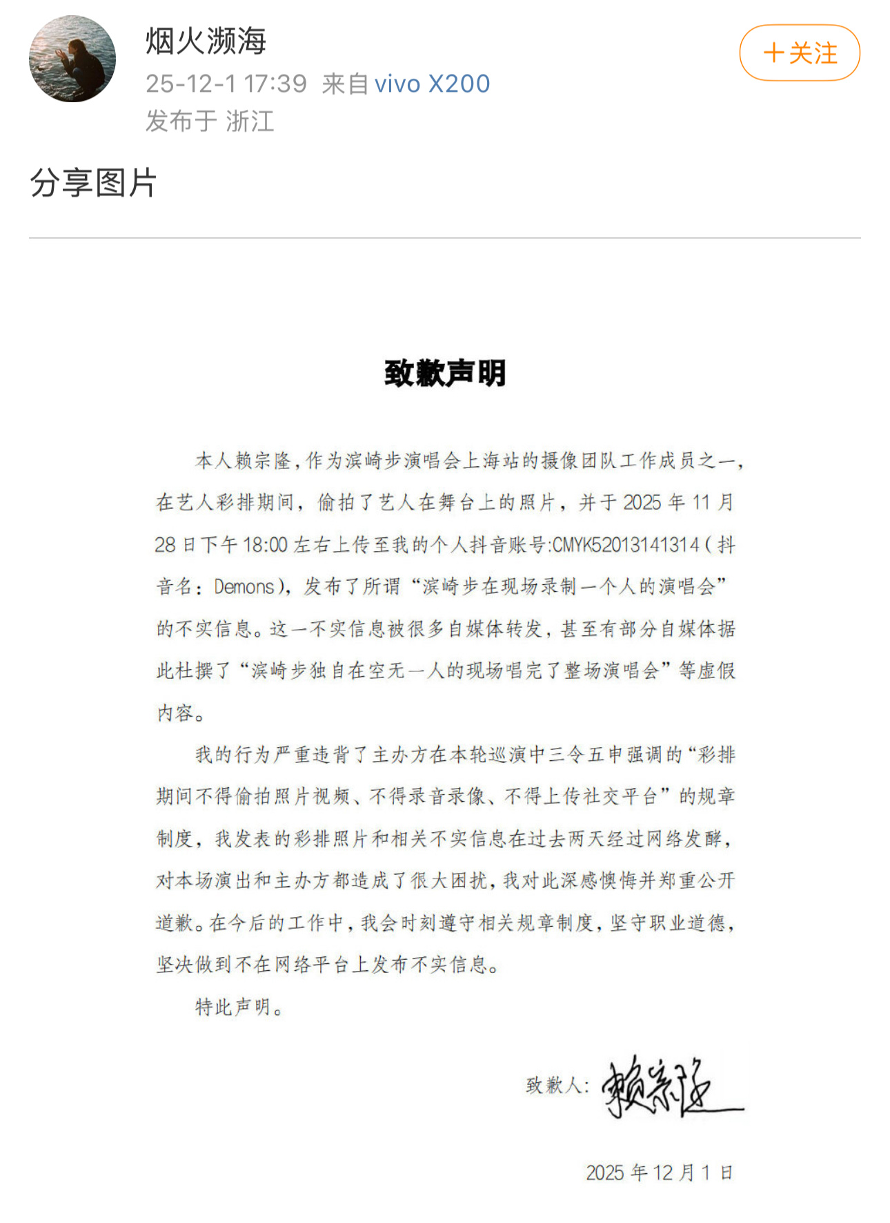 这也能有个反转?所谓滨崎步“一个人的演唱会”信息不实,系彩排期间被偷拍,摄像团队人员公开致歉。