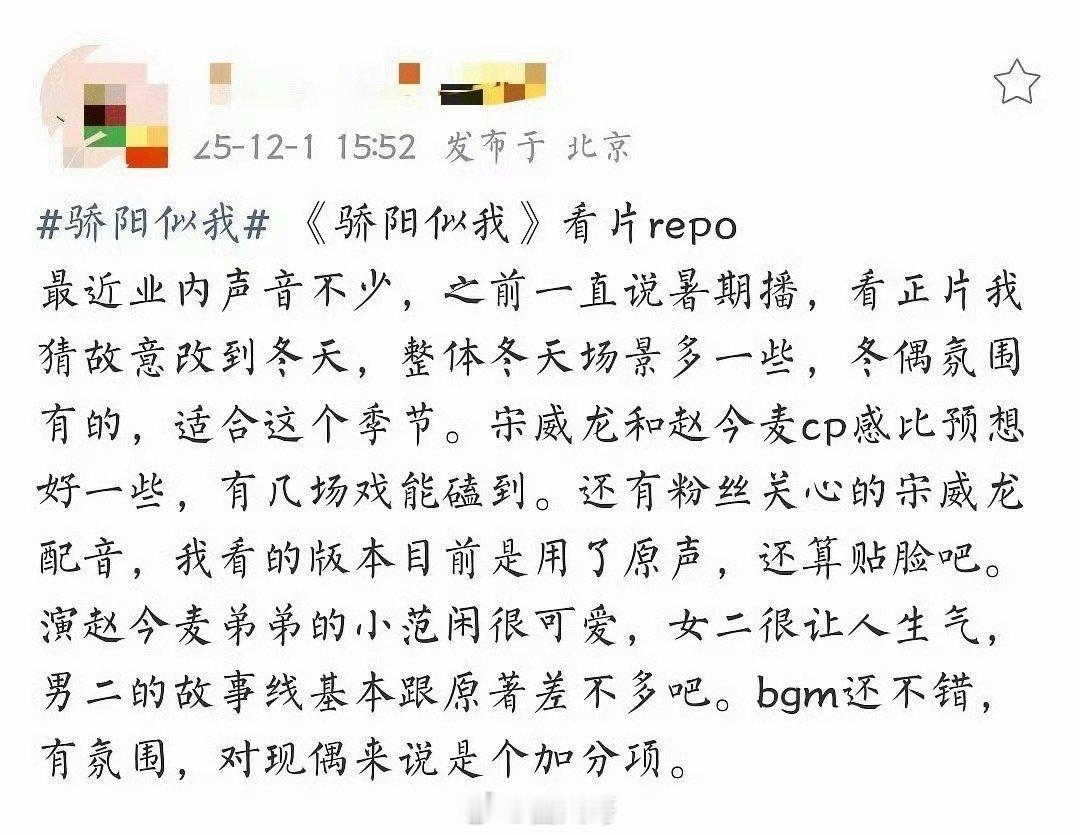 宋威龙赵今麦骄阳似我看片repo 哦哟,终于等来宋威龙、赵今麦主演的电视剧《骄阳似我》的新消息了,有网友分享了新剧的看片repo,冬天的剧情,赵今麦和宋威龙的cp感看起来很是带感,已经等不及要追剧了~赵今麦宋威龙骄阳似我看片反馈