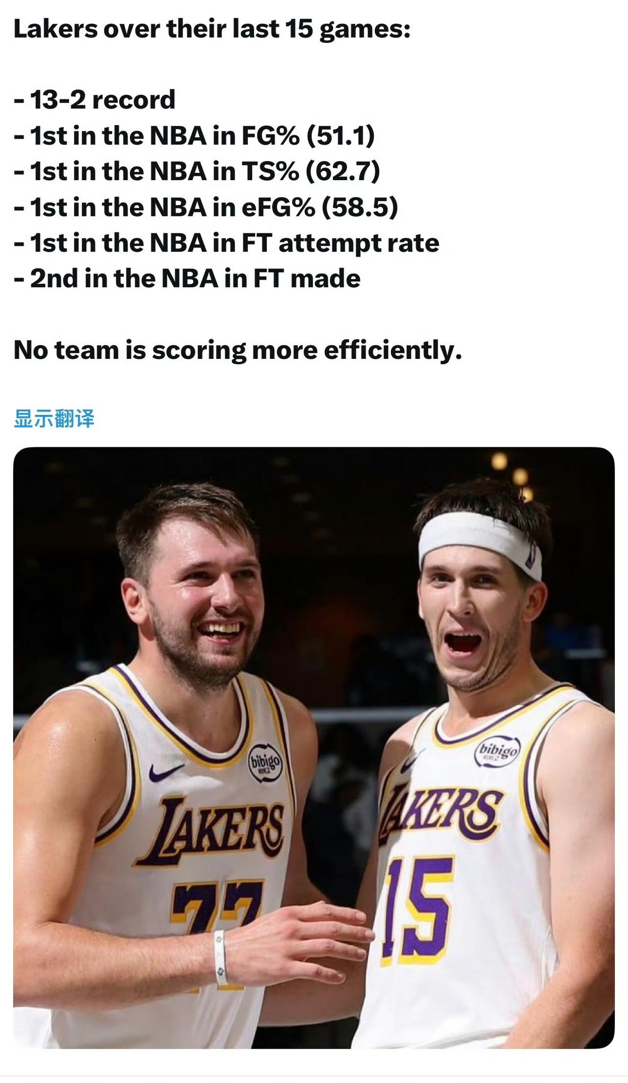 湖人最近15场的数据表现: 13胜2负(仅次于雷霆) 投篮命中率第一, 真实命中率第一, 有效命中率第一, 罚球率第一, 罚球命中数第二。 克莱的三分球和库里相比如何