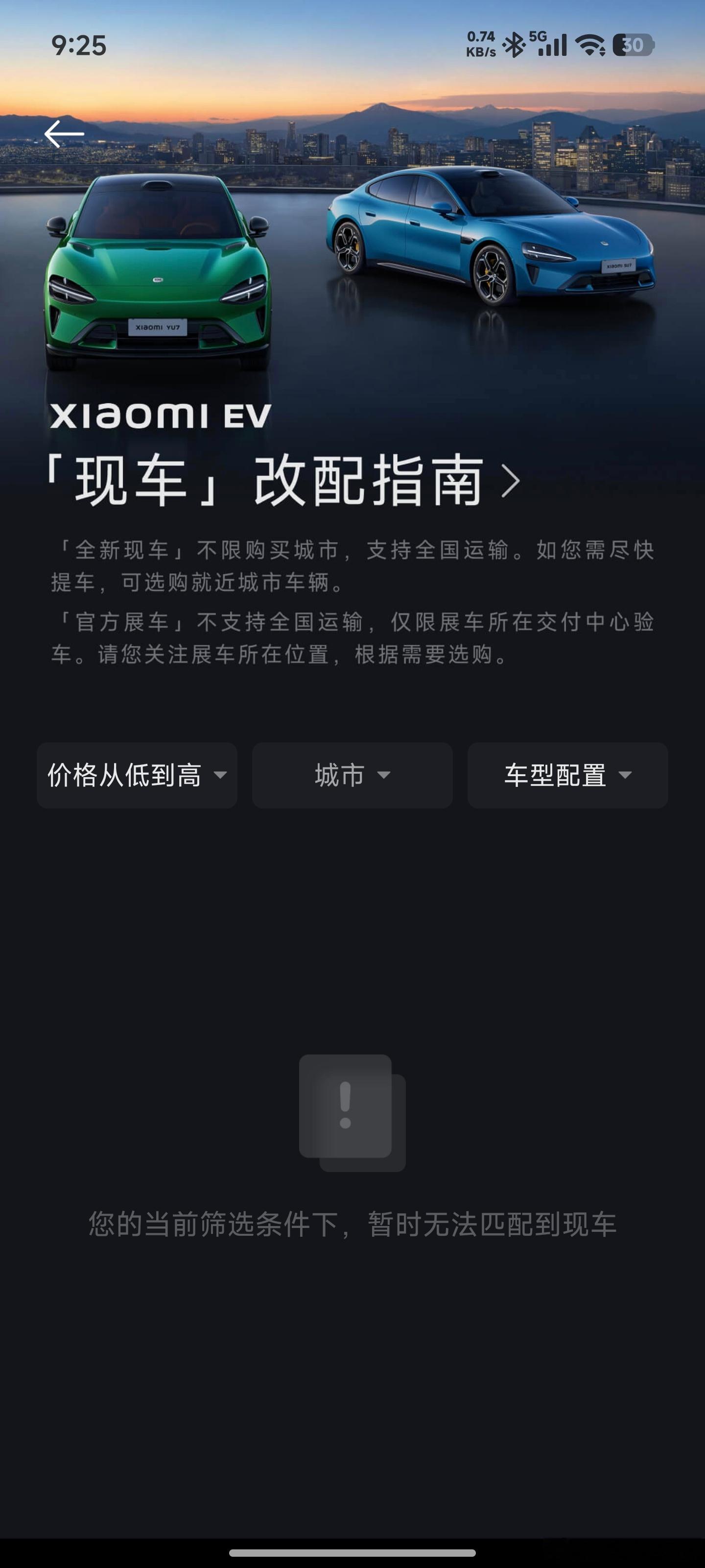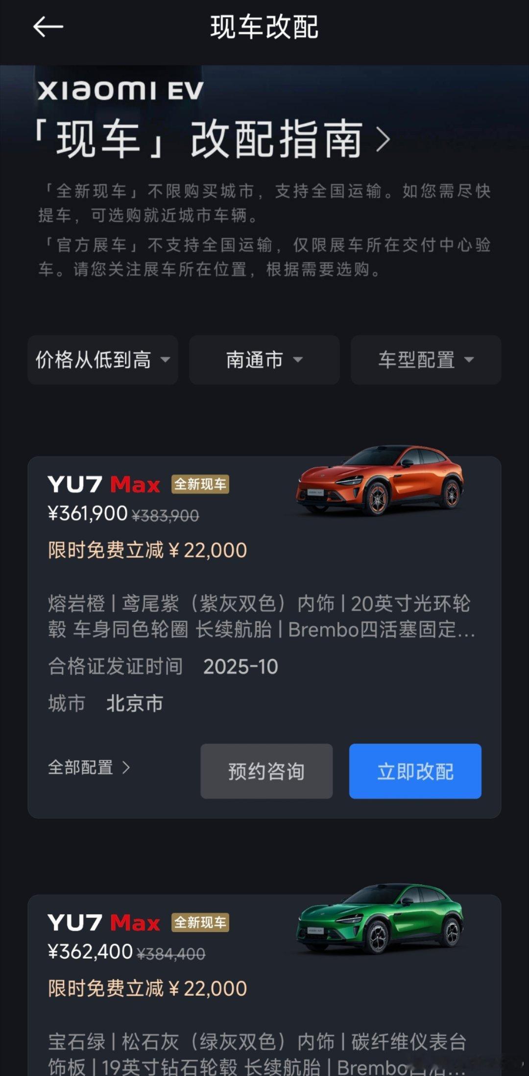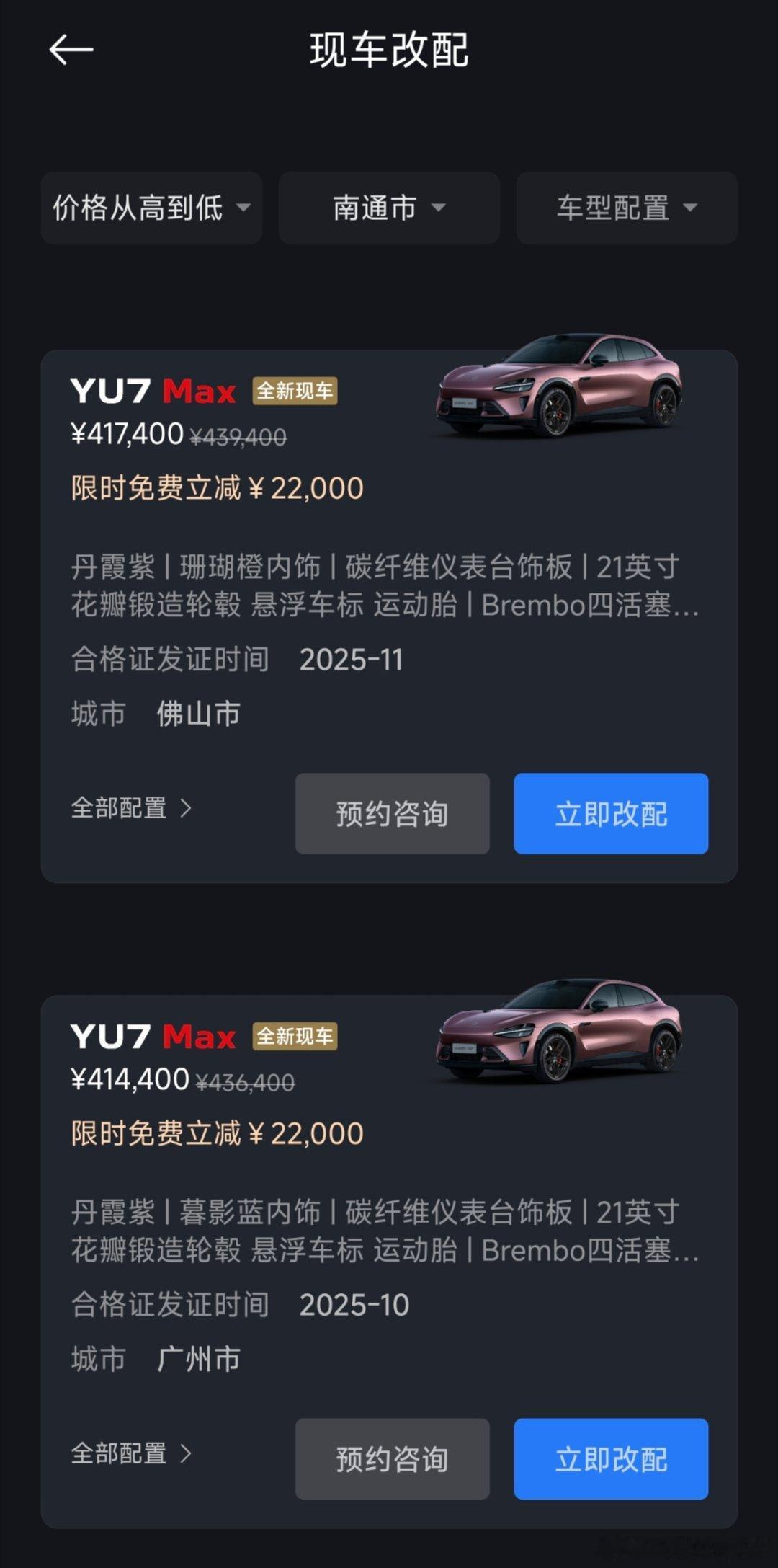 小米有现车可以选了,基本都是别人订的配置,然后弃单了昨天和今天看,YU7全是max版,全部有2.2万的优惠,锁单但还没提车的朋友可以看看有没有心仪的配置最便宜的36.2万,最贵的41.7万,根据选配不同。为啥弃单的没有标准版呢我蹲一个标准版弃单的,咨询一下详细型号,确认电池品牌,好像是个搞确定性的办法。小米汽车现车选购即将开启
