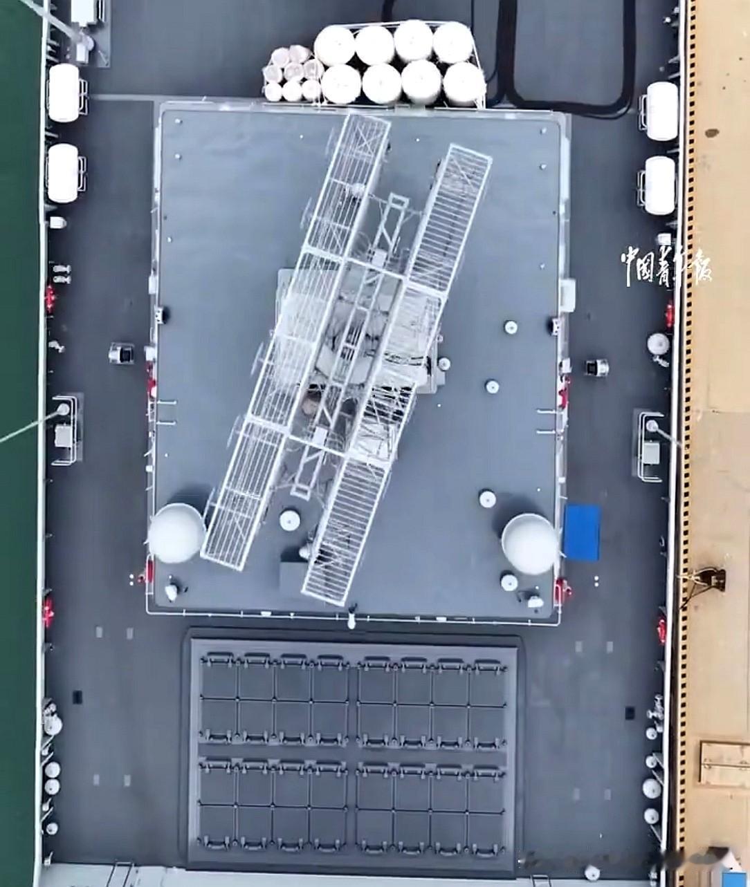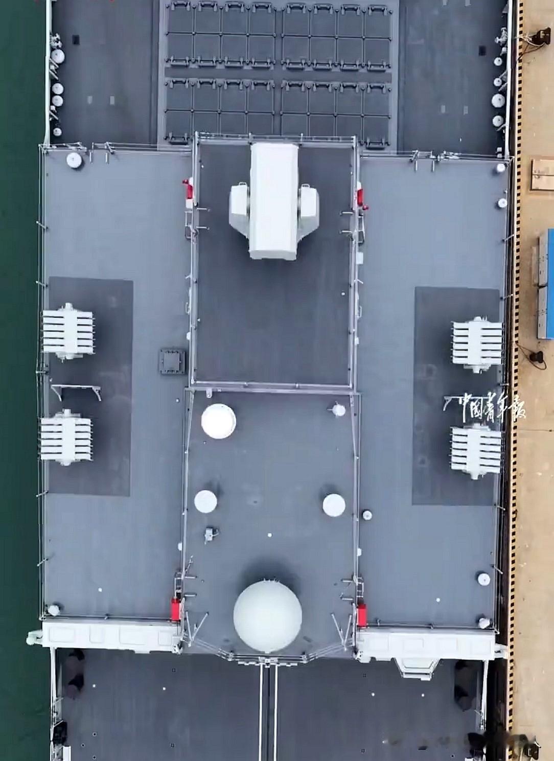 最新批次的052D型(网友称为052DM型)的最大变化就是主桅杆上的雷达更新为368型快反雷达! 图1️⃣是目前唯一一张从顶部俯视新雷达的照片,的确这双面旋转雷达的前后两面的厚薄是不一样的,从顶部俯视更加明显了。 图2️⃣为米波反隐身机雷达(俗称苍蝇拍),也是少有的俯视图,这么看像个铁框架!后部的850大坑垂发系统也很清晰了。 图3️⃣为机库顶部的装备,海红旗10近程防空导弹还有4部干扰发射器,比之前的052D驱逐机库顶部舰都干净很多。 图4️⃣和图5️⃣,就是火力输出主力选手。 052D驱逐舰 052d改进型 052dl 052d沧州舰