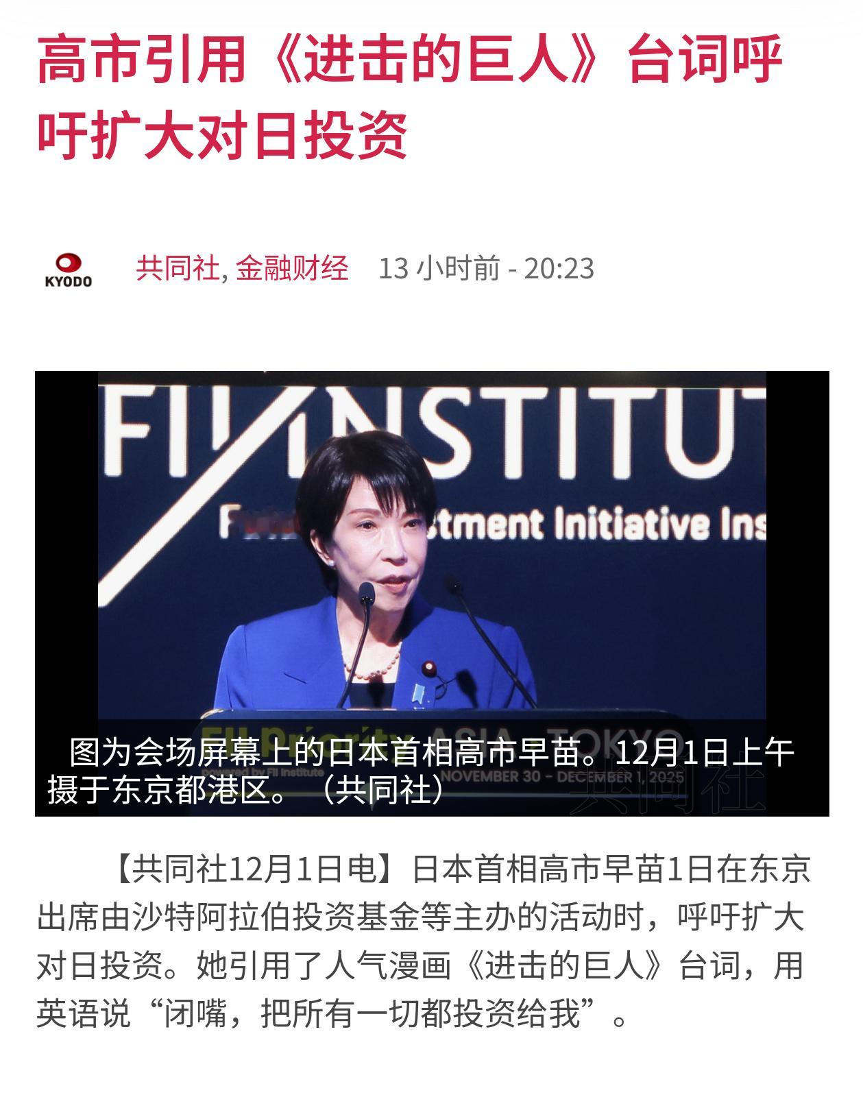高市早苗引用进击的巨人台词呼吁扩大对日投资。➤现场cos一下车力巨人效果就拉满了。热点观点高市宣称日本又回来了