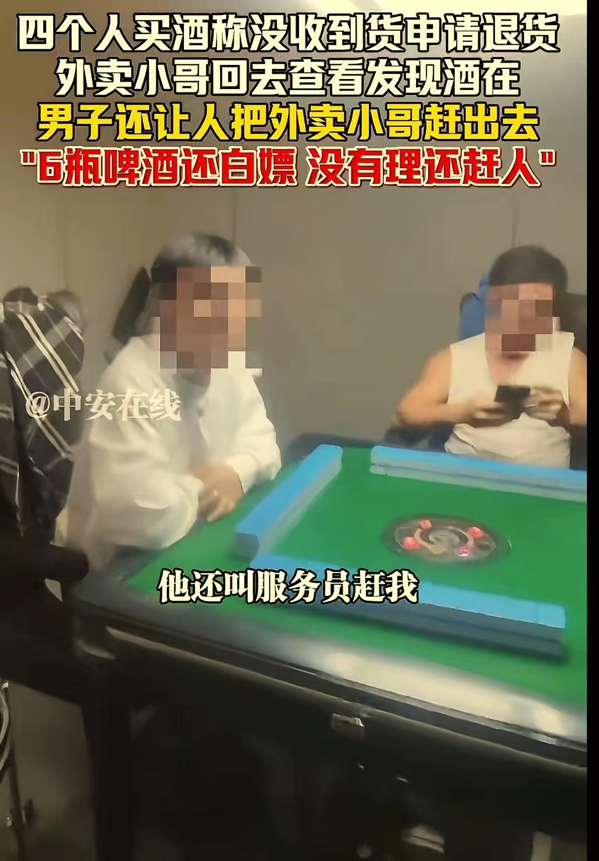 真是活不起了!广东佛山,四个奇葩在棋牌室点了6瓶啤酒外卖,结果等骑手送到,他们却动起了歪脑筋,谎称没收到货申请了退款!骑手接到投诉返回,看到酒已经被他们打开喝了!骑手质问他们为什么要白嫖,可没想到他们态度嚣张,叫保安把骑手赶出去! (来源:凤凰网) 那天,阿彪接到这个送6瓶啤酒到棋牌室的单子后,马不停蹄地就出发了。在规定时间内,阿彪把酒送到了指定房间。 送进去的时候,他还特意跟顾客确认了一下:“这是你们点的啤酒吧?”顾客一口应下,阿彪这才放心离开,紧接着又赶着去送下一单了。 可谁能想到,没过多久,阿彪就接到了商家的电话,商家说顾客投诉啤酒没送到。 阿彪当时就懵了,自己明明亲手把酒送进去,还确认过的呀,这顾客怎么说没收到呢? 虽然6瓶啤酒也就几十块钱,但阿彪觉得顾客的行为肯定有问题,他决定把事情弄个水落石出。于是,阿彪又急匆匆地跑回了棋牌室。 等阿彪一进房间,眼前的景象差点没把他气晕过去。只见那4个人正舒舒服服地打着麻将,桌上的6瓶啤酒已经被打开喝得差不多了。 阿彪又气又恼,赶紧掏出手机拍下证据,然后质问他们:“你们啤酒都收到喝了,为啥要说没收到,是想白嫖吗?” 可这四个人呢,脸皮比城墙还厚,一点羞愧的意思都没有,一边继续打着麻将,一边还扯着嗓子喊服务员,要把阿彪赶出去。 阿彪心里那个气啊,他们乱投诉,自己可是要被平台扣款的,这损失谁来承担? 一气之下,阿彪把这事儿发到了网上,想让认识这四个人的都看看他们这恶劣的人品。 此事引发了热议,有网友说,看房间扔一地垃圾,就知道他们没素质啦?这种人真恶心,报案查一下聚众赌博,看转账记录,定性一下赌博金额,送进去! 也有网友说,一摸一样的,但我送的是电竞酒店,放门口了,但是没有拍照,然后顾客三分钟后申请退款,第二天客服打电话给我说顾客申请退款了,扣了我50块钱和13块钱的餐损,不明白现在的人怎么那么坏,不知道找谁说理去! 还有网友说,真是光“宗耀祖”,竟然还上了凤凰网,祖坟可以改旱厕了!现在虽然科技进步了,但人性却倒退了!因为诚实讲信而吃亏被认为傻,占小便宜确被认为精明。 在我看来,这四个人的行为简直就是道德的沦丧!为了区区几十块钱,就干出这种坑蒙拐骗、耍无赖的事儿,还如此嚣张跋扈,完全不把别人的劳动成果和权益当回事。 他们以为自己占了点小便宜,实际上却暴露了自己内心的贪婪和丑恶。 这种行为不仅损害了骑手和商家的利益,更破坏了社会的公序良俗。 如果人人都像他们这样,为了蝇头小利不择手段,那我们的社会将变成什么样子? 诚信和善良难道就要被这些无耻之徒践踏得一文不值吗?我们绝不能让这种不良风气蔓延下去,必须让这些人受到应有的谴责和惩罚!