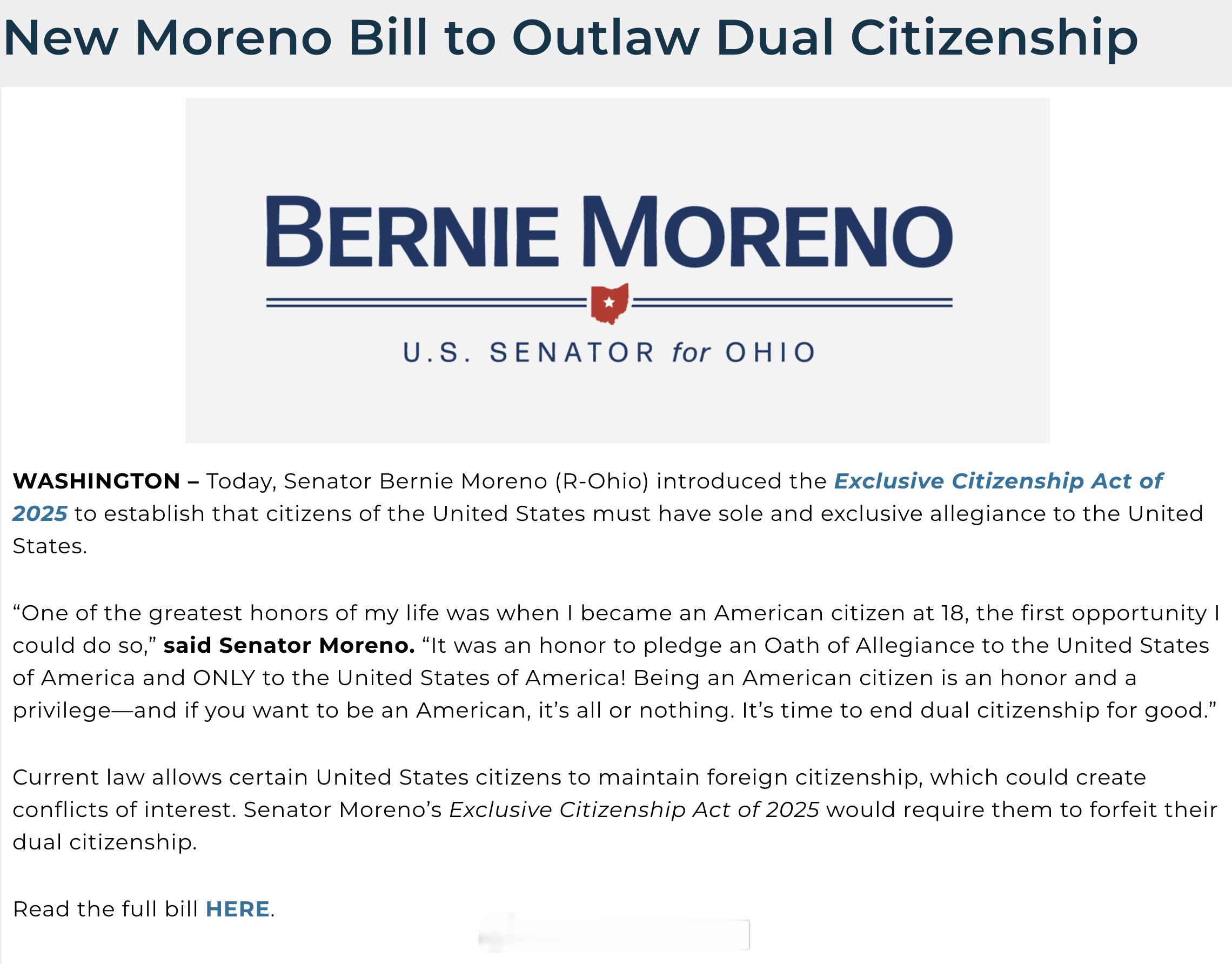 俄亥俄州共和党参议员 Bernie Moreno 在周一提出一项法案,要求拥有外国国籍的美国公民必须在美国和他国之间做出选择。该法案还规定,若美国公民未来申请外国国籍,将等同于自动放弃美国国籍。