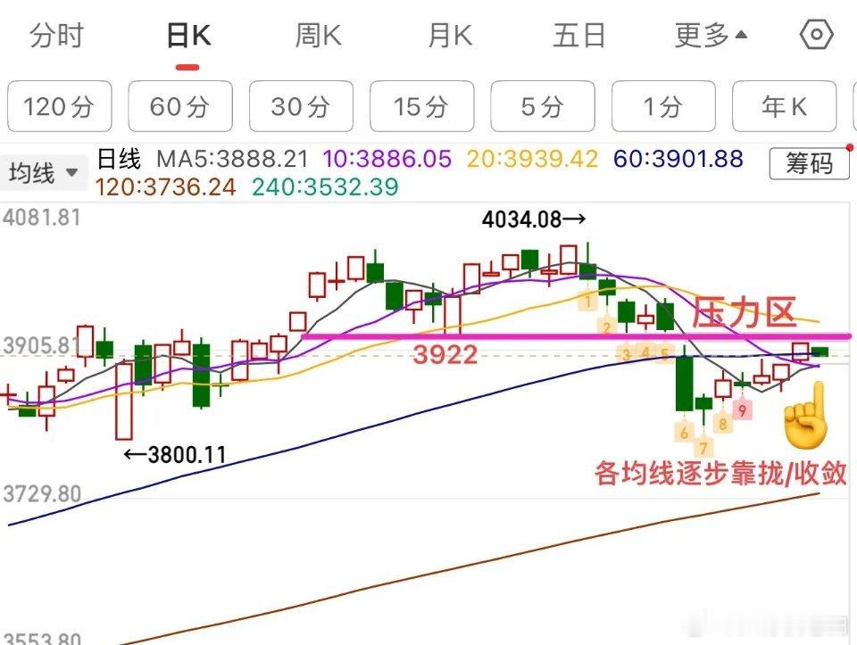 2025.12.2早评: 上证指数弱势开局,小幅收阴概率,深成指以及双创均为两阴一阳盘,总体小阴概率大。 大盘观点:上证指数回补缺口仅一步之遥,需要注意的是接近3922颈线和缺口(3927)附近重要压力,一次性突破难度较大,大概率会出现一定的分歧。 从均线的角度看,上方20日线继续向下,下方5/10日线逐步拐头,最终会形成收敛之势,短线来看还有一定的空间,大概率围绕上下均线区间震荡,往上不追,往下关注均线支撑。 策略上,在重要压力位不可激进,再加上指数连阳大概率会有分歧反复,但回调也不用担心,关注下方5/10日均线支撑。 后续均线逐步靠拢粘合,即选择方向,上或下关注均线得失即可。 个人观点,仅供参考!