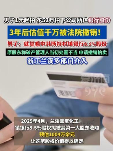 浙江,一公司破产,股权一元起拍,男子以52万元拿下全部股权。不料三年后得知,股权中8.5%的村镇银行股份估值超千万,可这份“天降红利”竟被法院裁定收回,原利害关系人起诉获支持,男子怒而维权,多方已介入调查。 “明明是别人办事不规矩,凭啥让我们买单!” 2025年11月,浙江兰溪法院里,钱先生的律师气得捶了桌子。 法庭的大屏幕上,一边是1004万元的股权价值,一边是只给58万的补偿方案,差了快20倍。 钱先生看着这两个数,心里堵得慌。 三年前他花52万“捡漏”拍下的股权,怎么就成了别人的?这场从1块钱起拍的官司,越闹越复杂,最后还惊动了好几个部门。 庭审正吵到关键处,对方律师嗓门也不小:“这股权是金融资产,本该找专业人算价值,可负责处理的人倒好,拿三年前的老账本定价,这不是糊弄人吗!” 法官打断他俩,盯着负责处理破产资产的管理人:“你们到底能不能直接去银行查财务数据?” 那负责人脸一下子白了,手都在抖:“我们试过,但银行要原股东同意,我们没辙啊……” “别找借口!”审判长声音一沉,“这事本来就是你们的活,不用原股东点头,这是你们该干的!” 法庭里顿时炸开了锅,还有个更离奇的事被扒了出来。 钱先生的律师点开一段视频,指着上面的银行流水说:“大家看,有人说欠了1800万可这钱从原股东那边转出去,三天就转回来了,借条上的签字也是假的,根本就是故意拖着不让股权交易!” 法庭外面,原公司股东的人也急得转圈,他们不仅想把股权要回来,还得让办事不力的管理人赔290万,这官司也输不起。 时间倒回2022年12月,网上正在拍卖一家破产公司的股权,起拍价才1块钱。 钱先生平时就喜欢关注这类拍卖,他仔细查了两周:公司股权没抵押,名下的银行股份能赚钱,拍卖流程也没问题。为了这事,他还准备了200万,就怕抢不过别人。 网上拍卖直播间里,九个竞买人抢得火热,你来我往加了698次价。 最后,钱先生以52.15万拿下了,看着屏幕上“竞拍成功”的提示,他高兴地倒了杯茶,以为捡了个大便宜。 可他不知道,拍卖结束才十分钟,原股东那边就收到了消息,有人偷偷笑了。 没想到,才过了27天,法院传票就寄到了钱先生手里。 有人说这家破产公司欠了他1800万,还申请把钱先生拍下的股权冻了。 “当时我以为就是普通欠债纠纷,没当回事,哪想到一冻就是三年。” 后来钱先生回忆,这三年里,他名义上是股东,却啥权利都没有,连银行分红都查不到,只能看着股权被“锁”着。 转机出在2025年4月,那家银行要回购股份,请人算了算,钱先生手里的8.5%股份,居然值1004万!翻了快20倍的收益,让钱先生一下子看到了希望。 可还没等他高兴多久,原股东的亲戚徐先生就告到法院,说之前的拍卖不算数,要撤销。 这事越闹越大,公安、市场监管这些部门都联合起来查了。 2025年11月,核查的人在会议室里对着银行流水分析:“你们看,那个说欠1800万的周某,他老婆以前是原股东公司的财务总监,刚离职没多久。 这钱转出去又转回来,根本没真借钱,就是故意捣乱!” 另外一边,核查的人还发现,负责处理破产资产的管理人,三年前也干过类似的事。 拍卖金融股权时没找专业人算价值,当时就被警告了一下,没受啥重罚,所以这次又敢这么糊弄。 现在,这个管理人已经被停了半年业务,还得赔钱,负责人三年内都不能再干这行。 核查现场的桌子上,放着一份整改方案。监管的人说:“以后再拍卖这种特殊资产,得专门整个板块公示信息。 评估的人靠不靠谱、银行最近赚了多少钱,大家一眼就能看到,不用再到处打听。” 现在,类似的改变已经开始了,最近网上拍卖另一家公司的银行股权,页面上写得明明白白:前三年的经营情况、评估机构的资质、股权能不能分红、有啥风险,全都列出来了。 这些变化,都是钱先生这场官司逼出来的。现在,钱先生还在要求额外补偿,法院还没最终判决。 “就算拿不到那1000万,也希望别人别再踩我这个坑。”钱先生说这话时,虽然有点遗憾,但也看得开了。 这场官司没有赢家,却让不少人看清了“1元起拍”背后的门道。 以前,这种拍卖可能藏着很多猫腻:信息不透明、有人故意设障、办事的人敷衍了事,让想正经投资的人望而却步。 现在不一样了,信息越来越公开,监管越来越严,办事不力的人要被追责,守规矩的人也能得到保障。 以后再有人想参与这类拍卖,看到的不只是诱人的低价,还有越来越完善的保障。 兰溪这场闹了三年的官司,虽然让钱先生的“千万梦”碎了,却让后来人少走了很多弯路。 它就像一个提醒:不管是办事的还是投资的,都得守规矩,只有这样,大家才能放心交易。 如果各位看官老爷们已经选择阅读了此文,麻烦您点一下关注,既方便您进行讨论和分享,又能带来不一样的参与感,感谢各位看官老爷们的支持!