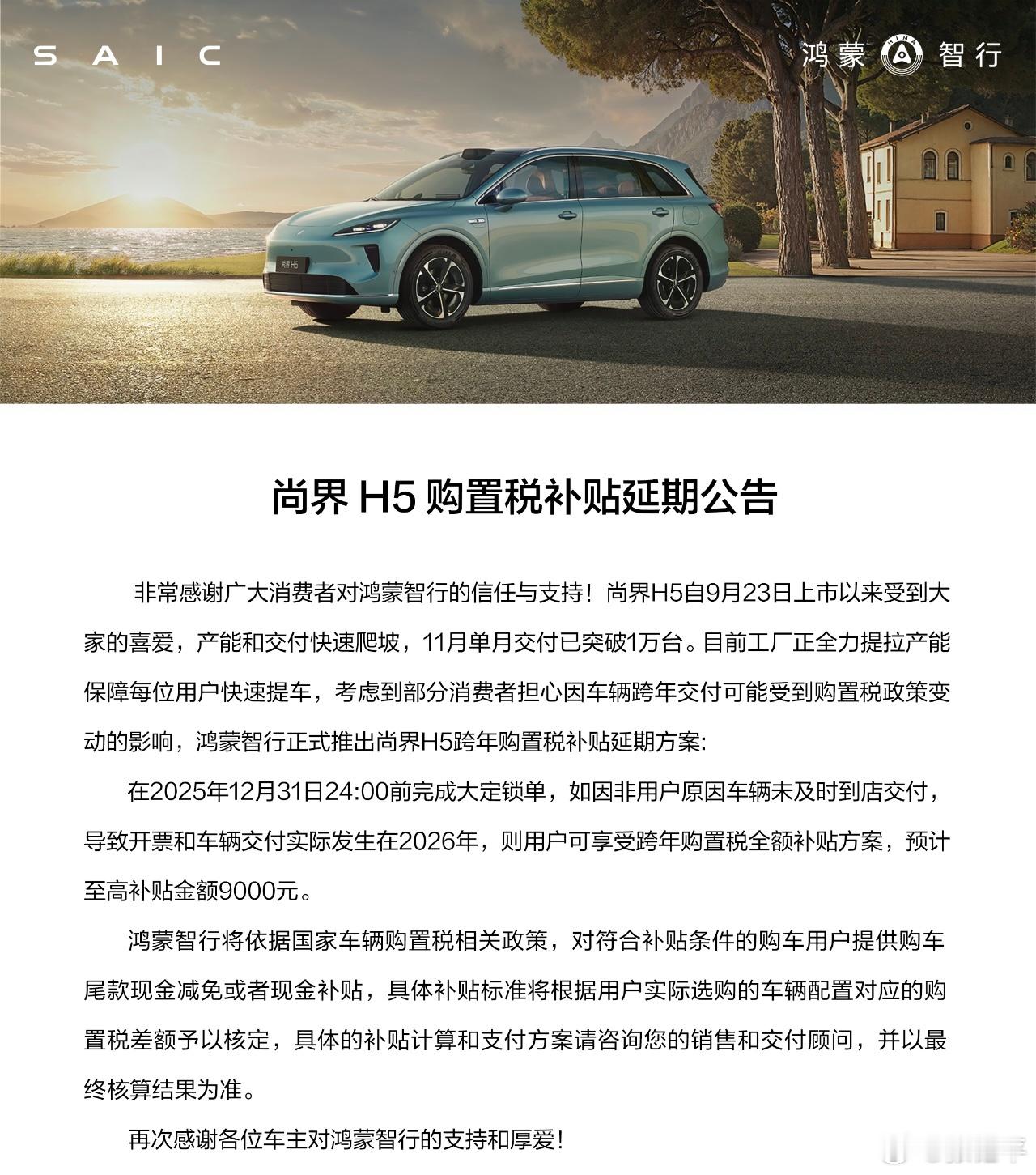 尚界H5购置税延期到12月底。我没说错吧兄弟们,这个月好多品牌都会追加兜底。新能