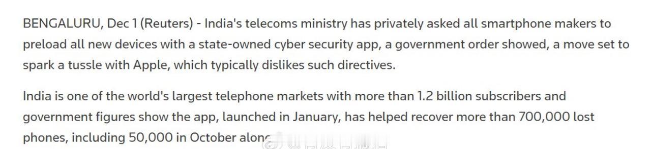 路透社:一份政府命令显示,印度电信部已私下要求包括苹果、三星、Oppo、vivo与小米在内的所有智能手机制造商在所有新设备上预装国有网络安全应用程SancharSaathi,且规定用户不能禁用该应用。对于已进入供应链的设备,手机制造商需要通过软件更新的方式推送进手机   这份11月28日发布的指令,要求所有主流手机制造商在规定时限内完成特定网络安全应用的安装部署,覆盖从新出厂设备到存量在用手机的全范围,用户既不能卸载也无法禁用这款应用,一场涉及全行业的合规浪潮就此拉开序幕。   这项政策有着明确的执行细则与适用范围。   指令设定了90天的合规期限,仅私下发送给苹果、三星、Oppo、vivo、小米等指定企业,并未对外公开。   新手机方面,所有在印度激活的机型都必须预装这款名为SancharSaathi的应用;   存量设备则分为两类处理,已进入供应链的机型通过软件更新推送安装,而已接入印度电信网络的在用手机,需接受强制推送安装。   政策覆盖全行业主流厂商,没有任何企业能获得特殊豁免,印度电信部将应对IMEI复制伪造、设备诈骗及假冒设备流入黑市等问题作为推行政策的核心依据。   这项政策的核心载体,是名为SancharSaathi的网络安全应用,其上线至今已积累了可观的实际成效。   该应用具备三大核心功能,用户可通过它举报可疑来电、验证手机独有的IMEI号码,还能借助中央注册系统远程锁定被盗设备。   自今年1月推出以来,应用下载量已突破500万次,协助找回逾70万部丢失手机,仅单月最高就找回5万部,累计封禁了370万部问题手机,同时终止了3000万个欺诈性通信连接。   印度拥有12亿移动用户,是全球最大的电信市场之一,境内7.35亿部智能手机中,安卓设备占比超95%,iOS设备仅占4.5%,这样的市场格局为应用推广提供了广阔基础,而IMEI作为手机专属编码,也为应用实现设备管控提供了技术支撑。   在这场合规浪潮中,全球手机厂商都面临调整压力,其中苹果公司的处境尤为艰难。   苹果此前就曾因政府反垃圾短信应用开发问题,与印度电信监管机构产生过分歧,此次新规让其面临更大的合规压力。   该公司内部有明确政策,禁止在设备售出前预装任何政府或第三方应用,仅允许预装自家专属应用,这与印度的强制预装要求形成了直接冲突。   对于苹果而言,这无疑是一场艰难抉择,妥协意味着打破自身坚守的内部准则,不妥协则可能失去印度这一重要市场,有研究机构预判,苹果大概率会寻求折中方案,比如提议让用户在首次设置设备时收到安装提示。   其他厂商同样面临挑战,需要在短时间内调整供应链与软件推送体系,平衡合规要求与自身产品体系。   这项强制预装政策自推出后,也引发了外界的广泛争议。   有声音直接将此举定性为给手机安装“后门”,带着明确的批判倾向。   争议的核心聚焦在用户自主选择权上,强制预装且不可禁用的要求,让不少人质疑这是否过度干预了用户的使用自由。   印度本是有望成为全球最大手机市场的潜力股,这样的政策举措,难免让外界担忧会影响国际厂商的投资信心。   从行业层面看,这一政策打破了手机厂商在软件预装方面的自主决策权,重塑了区域市场的行业规则,甚至可能引发其他国家的效仿,加剧科技企业与政府监管之间的权限博弈。 面对这场行业风波,目前各方都保持着沉默的态度。   苹果、谷歌两大科技巨头未回应置评请求,三星、小米等主流硬件厂商也没有发表任何关于合规或反对的声明。   政策发起方印度电信部同样未出面回应外界的质疑,没有进一步解释政策细节或调整方向。   企业们的缄默,一方面反映出印度市场对其的重要性,不愿轻易公开对抗;   另一方面也暗示着政策带来的矛盾尚未找到妥善的解决办法,无论是苹果的内部政策调整,还是其他厂商的技术适配,都还处于观望和推进阶段。   这些合理看法仅为对事件的客观评判,占比远低于正文20%。   印度强制预装安全应用的政策,一边是政府维护网络安全、规范市场的诉求,一边是企业的经营准则与用户的权利诉求,三方的博弈还在继续,这场席卷印度手机市场的合规风暴,未来走向仍有待观察。   今天的分享到这里就结束了,大家对此事有何看法,欢迎在评论区留言和讨论,感兴趣的可以点击头像加关注,我将每日更新优质内容,我们下期见。