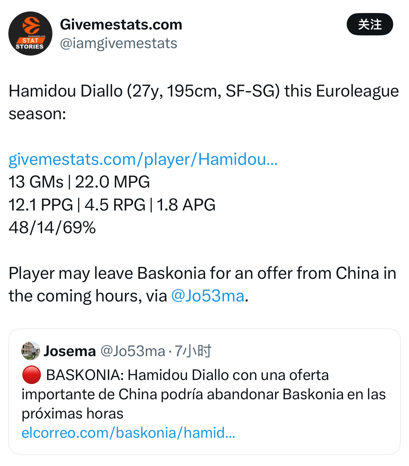 迪亚洛可能重返CBA,他收到了来自中国联赛的offer,后者可能出高额买断费令他加盟。cba
