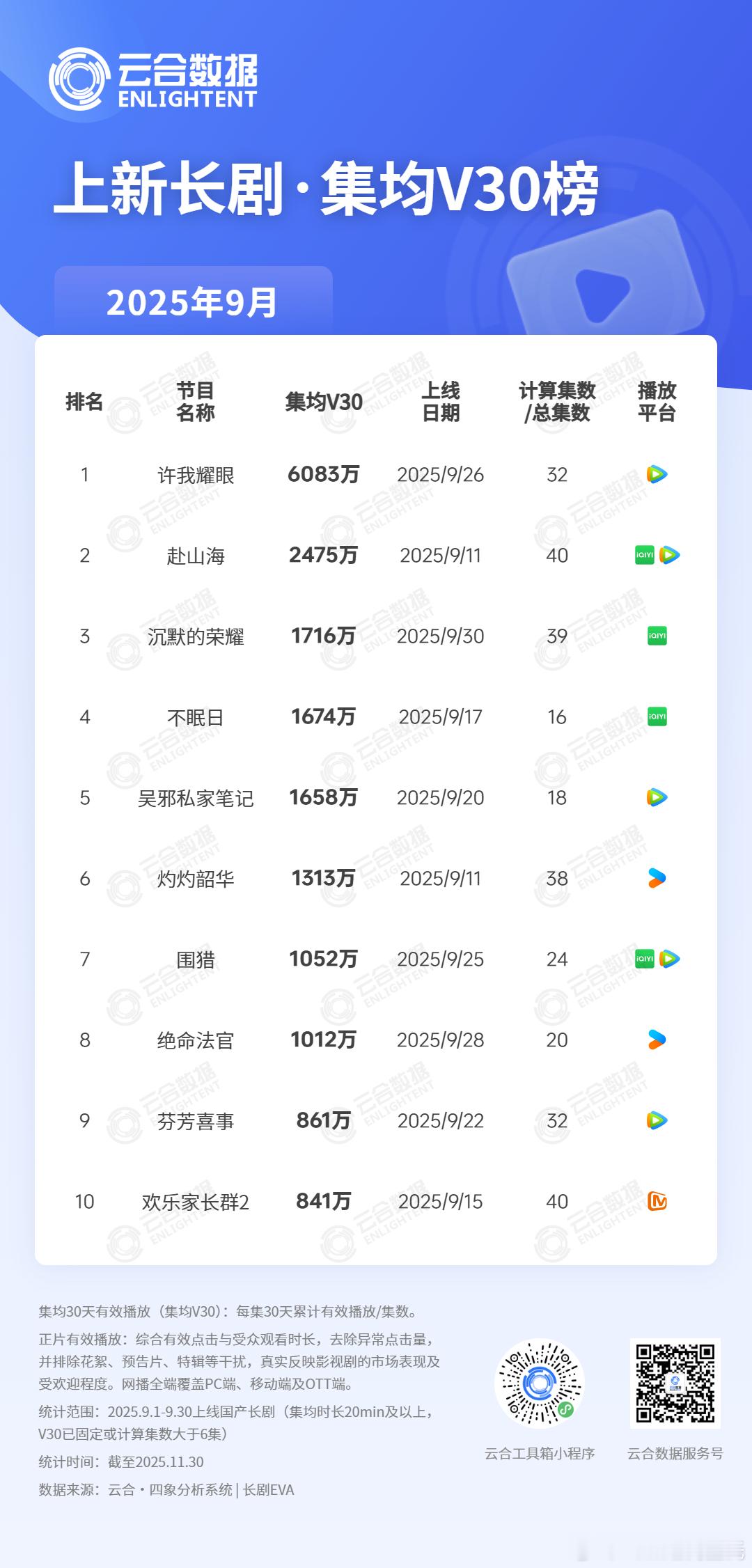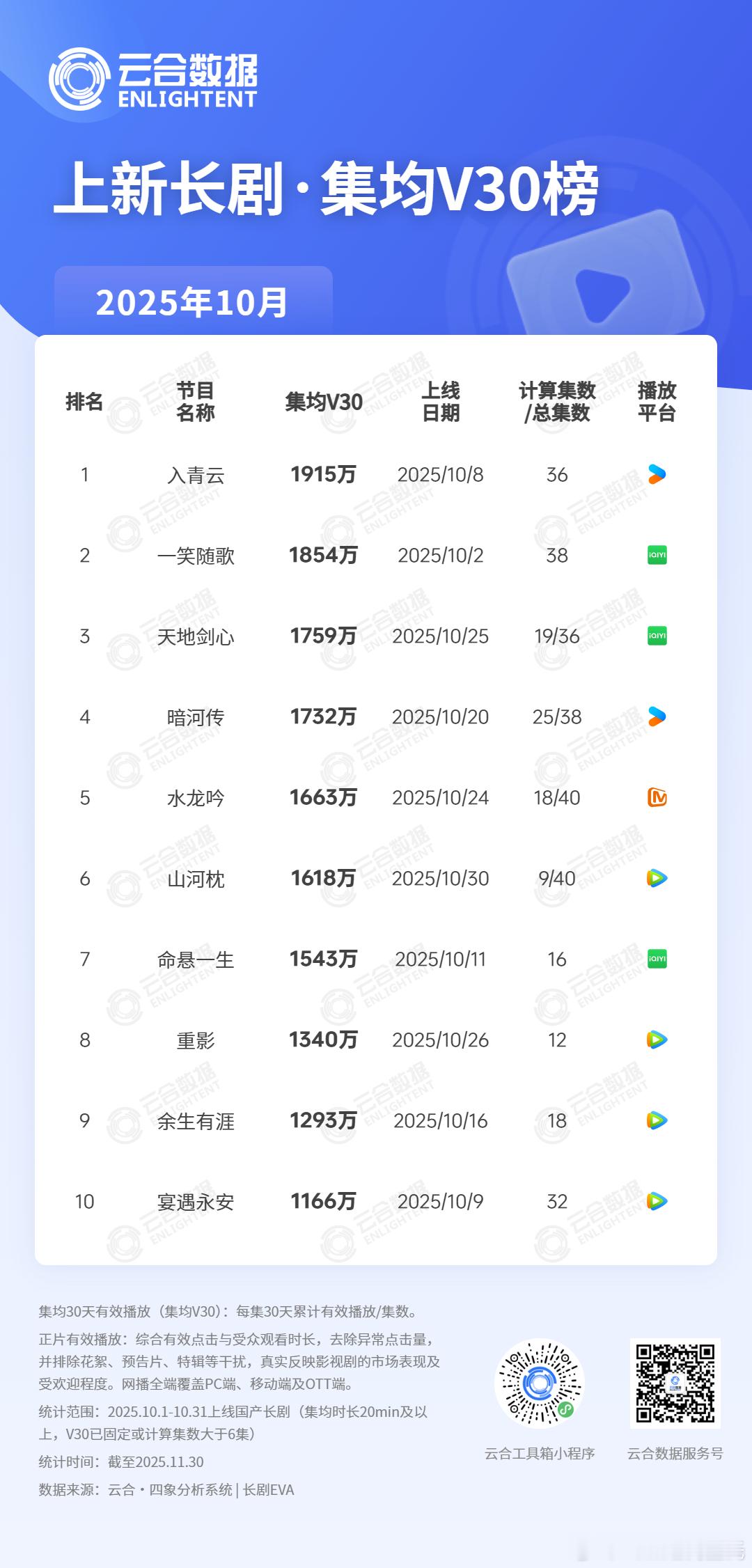 云合上新剧·集均V30(9-10月)天地剑心、暗河传、水龙吟、山河枕未固定v30不是热播期集均