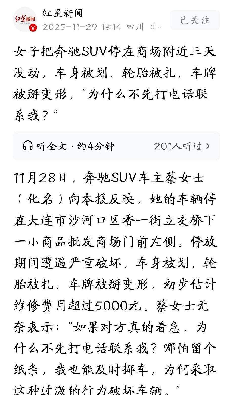 我勒个去,这年头停车难大家都知道,但你把奔驰SUV往商场门口一撂就是三天,还真把路当自己家车位了?结果呢?车身被划、车标被掰、轮胎被扎,维修费五千多!真是活久见,这可不是一般的倒霉,这简直是明晃晃的“教做人”啊! 我一看这新闻,心头火就窜起来了。你说这蔡女士,是真不把别人的生意当回事,还是觉得自己的病比所有人的时间都金贵?交警都打电话通知了,她一句“生病了”就撂挑子,合着全世界都得围着她转?别跟我扯什么停车难,车位紧张。大家都是打工人,谁不难?可你占着别人的财路,还不声不响地占三天,这就有点过分了吧?人家店里本来就没啥生意,你这辆“巨无霸”一杵,直接把人家的门脸儿都给挡没了,这不就是断人财路吗? 当然了,我不是说破坏人家的车就对,那肯定是不对的,违法行为!谁划车扎胎,这都得警察叔叔去管,该赔赔,该罚罚,跑不了。可我就是忍不住想说,有些事儿啊,真不是一句“我没收到通知”就能把自己摘干净的。你不是留了挪车电话吗?对啊,留了,但你接了交警电话还生病不挪,那是不是潜台词就是“别打给我,我懒得挪”?你是不是觉得,只有交警能管你,其他人都是空气? 所以,当她看到爱车面目全非,气炸了,觉得“不讲武德”的时候,我真的想问问她:你占着别人的地方三天,不也挺“不讲武德”的吗?人家商户眼巴巴地看着生意被你挡住,一天两天三天,从烦躁到焦虑到恼火,这中间的煎熬,她感受过吗? 这事儿说到底,就是个“人情世故”和“底线”的问题。停车的确是个老大难,谁都有着急的时候,偶尔停错地方,大家都能理解。但“偶尔”和“三天”是两码事。你把别人的容忍当成了理所当然,把自己的方便凌驾于别人的生计之上,那结果往往就是——人教会学不会的,事儿会狠狠地教你一回。五千多块的维修费,这还真是一笔“学费”,而且是血淋淋的教训。 希望这蔡女士,以后能长点心,把“方便自己,不影响他人”这八个字,真真切切地刻进脑子里。不然下次,保不准就不是划车扎胎这么简单了。咱们老百姓过日子,不就图个和气生财吗?你方便,我方便,大家才能都方便。