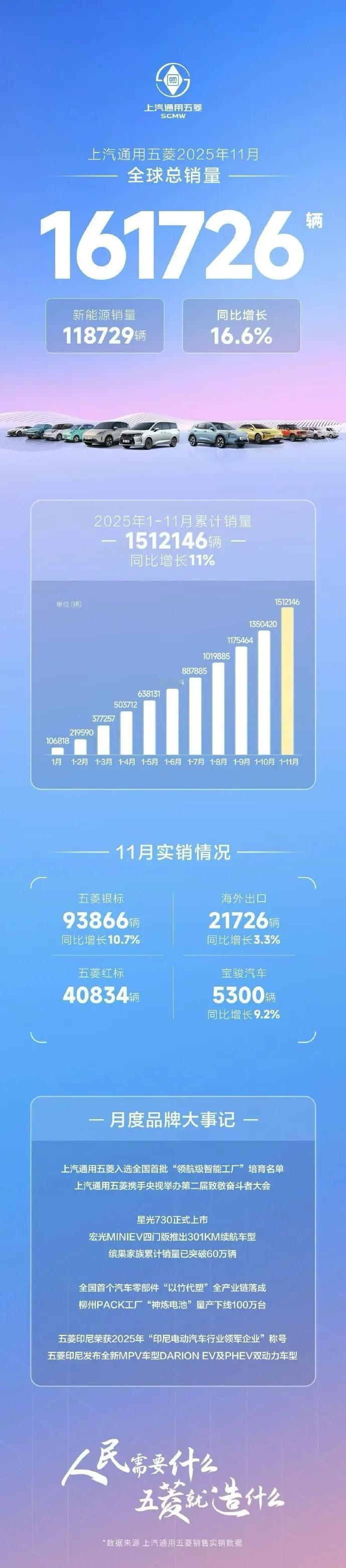 五菱11月销量炸场:新能源车狂卖11.8万+,油车基本成"配菜"? 来看看具体数据: ✅ 11月全球总销量161726辆,其中新能源车118729辆,同比增长16.6% ✅ 油车销量(总销量-新能源车)仅42997辆(新能源车占比直接干到73.4%) ✅ 五菱银标:93866辆,同比+10.7%(宏光MINIEV、缤果这些"国民神车"继续扛旗); ✅ 海外出口:21726辆,同比+3.3%(国货出海稳扎稳打); ✅ 宝骏:5300辆,同比+9.2%(虽然微增,但这基数…还在努力爬坡中[允悲])。