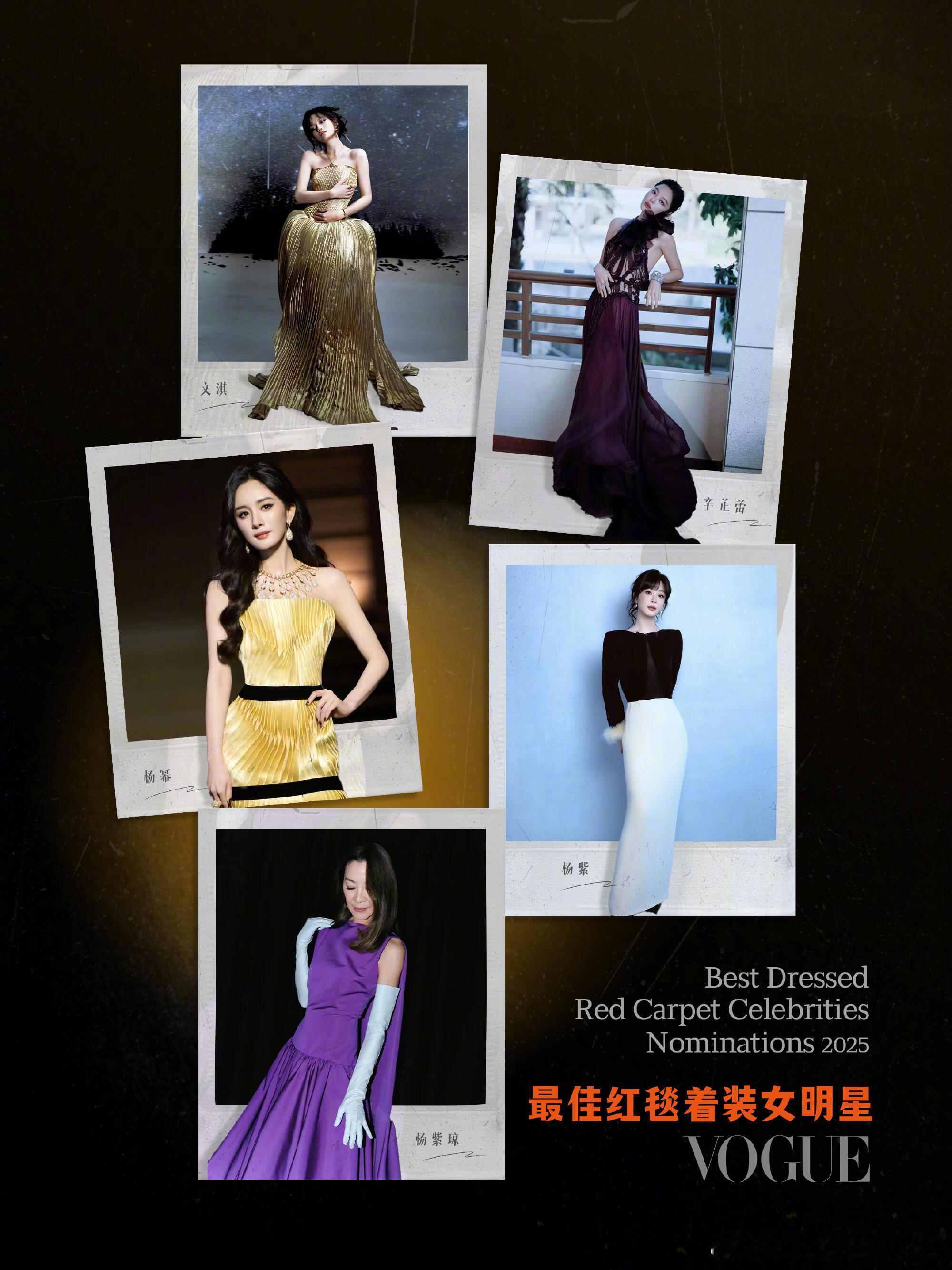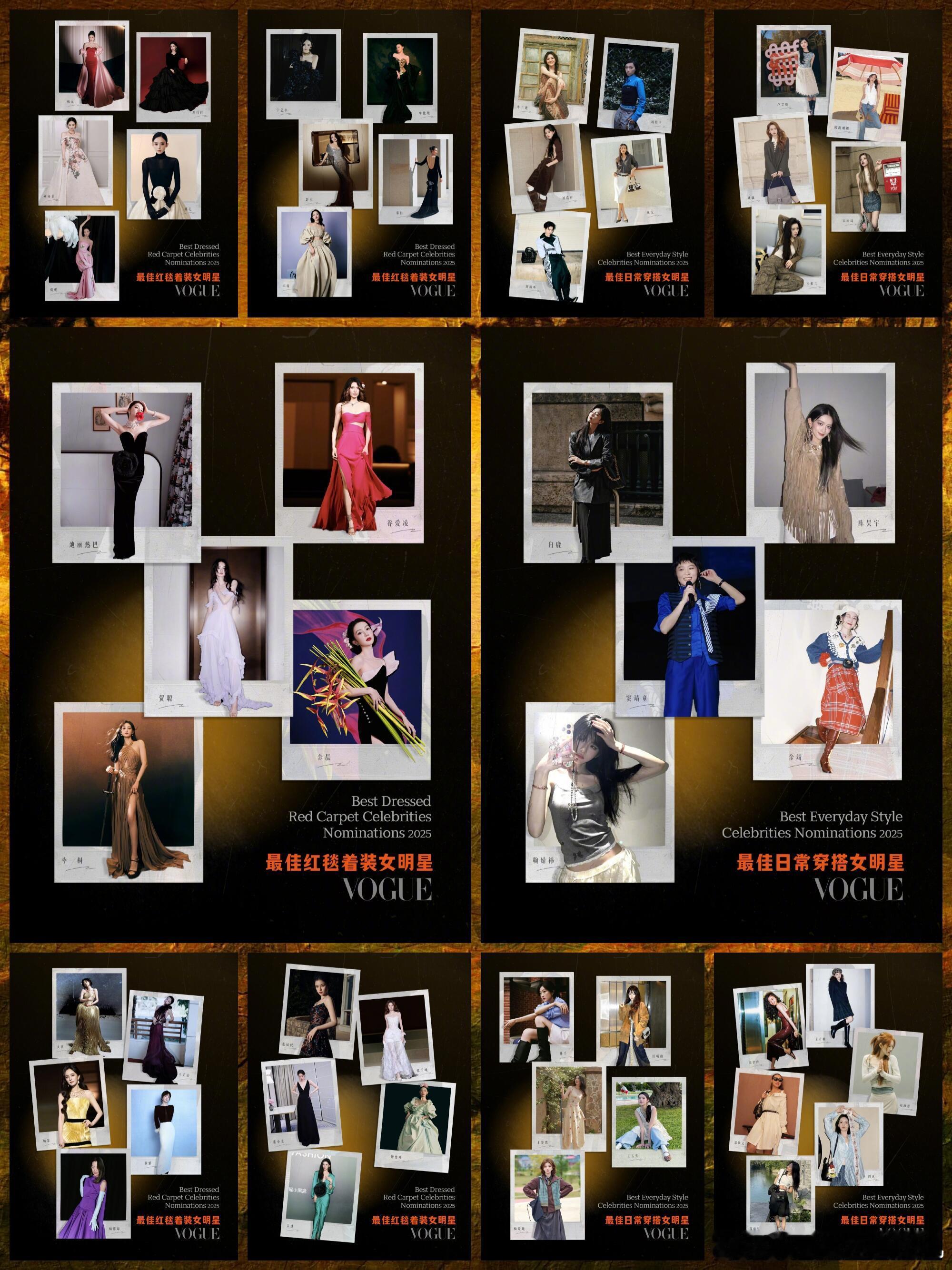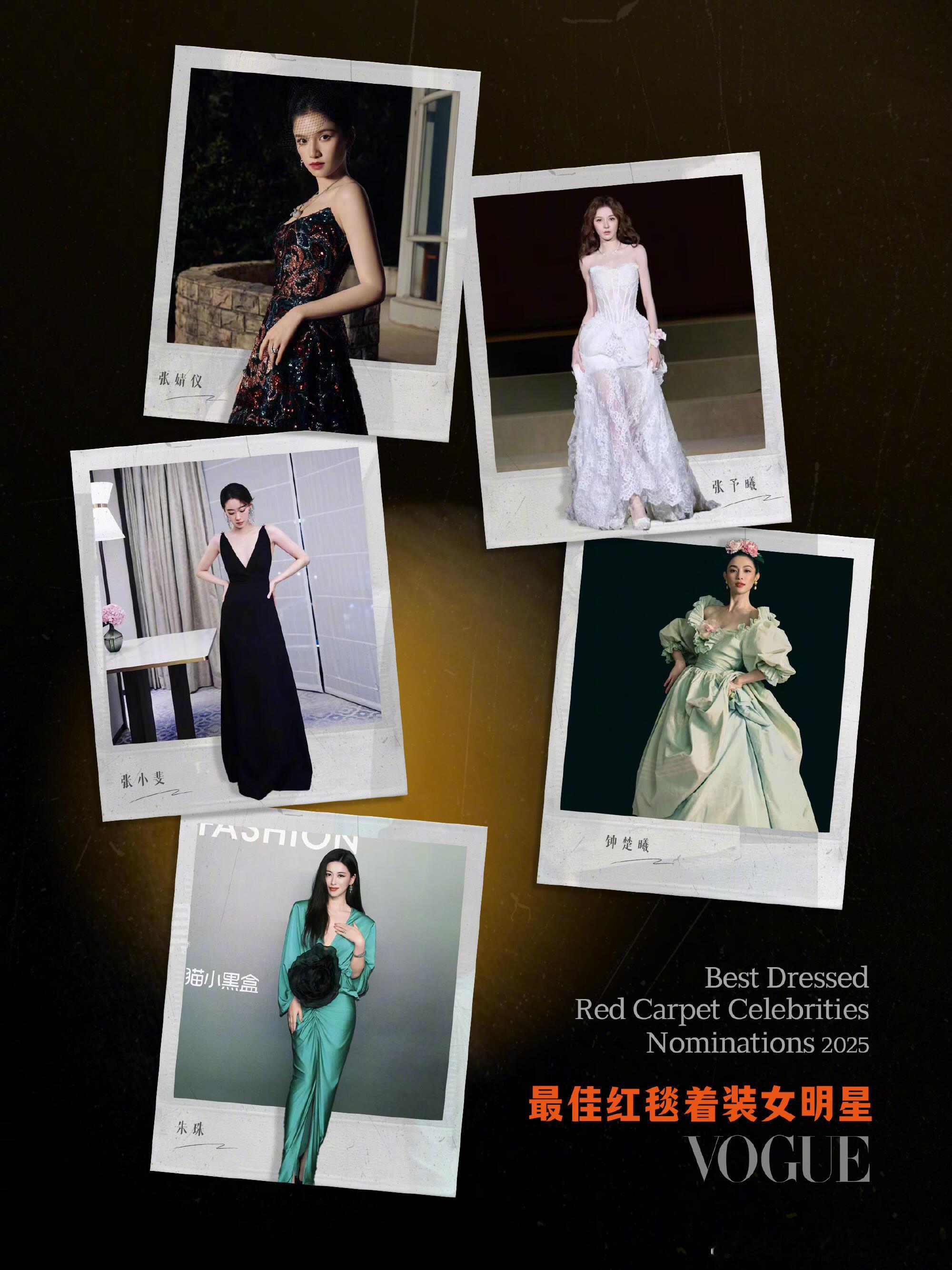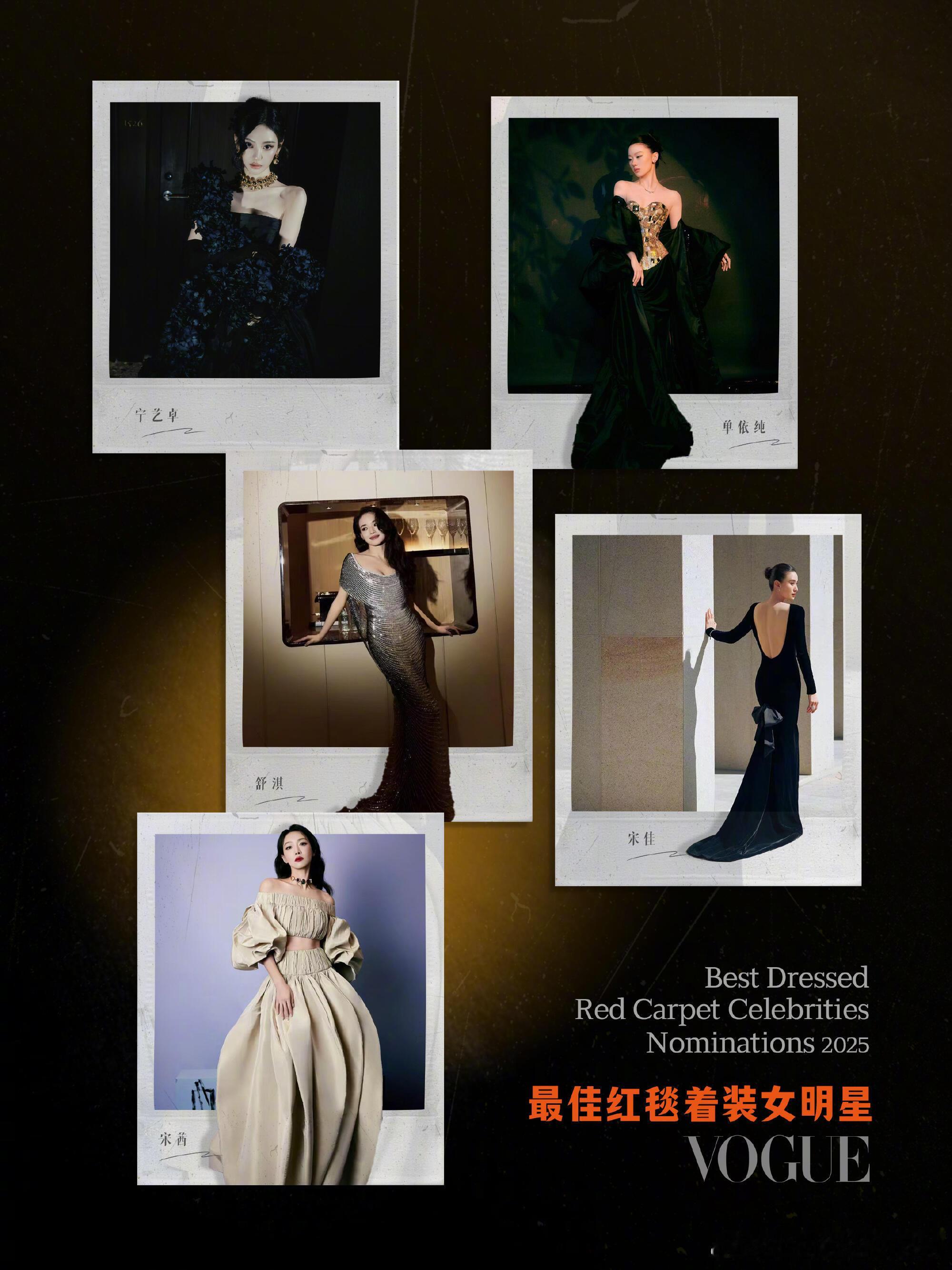 VOGUE年度最佳着装提名名单之女明星篇一、最佳红毯着装入围名单 迪丽热巴・迪力木拉提、谷爱凌、贺聪、金晨、李一桐、林允、刘诗诗、刘亦菲、古力娜扎、倪妮、宁艺卓、单依纯、舒淇、宋佳、宋茜、文淇、辛芷蕾、杨幂、杨紫、杨紫琼、张婧仪、张予曦、张小斐、钟楚曦、朱珠 二、最佳日常穿搭入围名单 白鹿、陈昊宇、童瑶、李雪琴、鞠婧祎、李兰迪、刘柏辛 Lexie、刘浩存、刘雯、刘雨昕、卢昱晓、欧阳娜娜、戚薇、宋雨琦、宋祖儿、孙千、田曦薇、王楚然、王玉雯、杨超越、易梦玲、章若楠、赵露思、郑钦文、周也、周雨彤 最终谁能入选呢?
