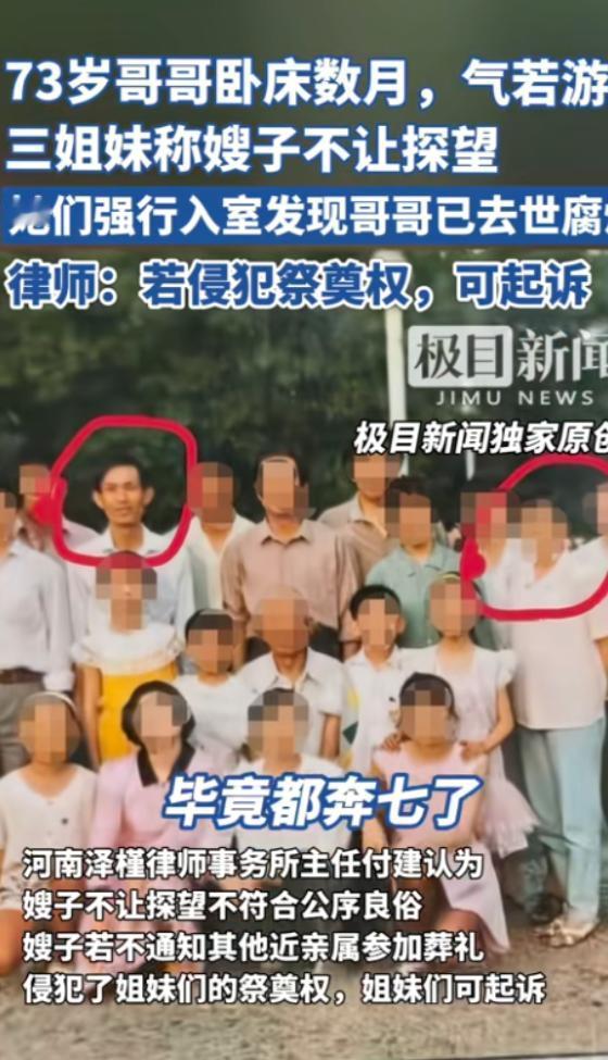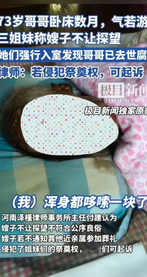“电视剧都不敢这么演!”近日,天津,一女子给哥哥打电话时,感觉哥哥已经说话气若游丝,但是嫂子却始终不让她上门探望,于是姐妹3人只好强行入室,却发现哥哥已经去世多日,遗体都已经开始腐烂。网友:这是什么操作? 事情的起因要从一通反常的电话说起,张女士有阵子没见哥哥了,心里惦记着就主动打了个电话过去,想问问哥哥的近况,可电话接通后听筒那头传来的哥哥的声音,让她瞬间心里一沉,那声音气若游丝,虚弱得像是随时要断气,完全不是平时的状态,张女士心里咯噔一下,当即就提出想上门探望,可这个合情合理的请求,却被嫂子一口拒绝了。 接下来的日子里,张女士只要提起探望的事,嫂子就会找各种千奇百怪的理由推脱,一会儿说哥哥在休息不方便打扰,一会儿说病情稳定不用惦记,总之就是死活不让她进门。 张女士心里的不安越来越强烈,她甚至想看看哥哥近期的照片,哪怕知道他安好也行,可嫂子连这点要求都不肯满足,她手里翻来覆去,只有一张年前拍的家族大合影,照片里的哥哥还精神矍铄,跟电话里的状态判若两人。 这毫无来由的阻拦,硬生生把姐妹间的牵挂,隔成了一道看不见的墙,疑云在 11 月 18 日这天彻底爆发,张女士实在按捺不住心里的担忧,就拉上了大姐和五妹,姐妹三人一起直奔哥哥家,势必要亲眼看看哥哥的情况。 可到了家门口,她们又吃了闭门羹,嫂子隔着门撂下一句 “下午再来”,就再也没了回应,姐妹三人只能在门口焦急地等待,好不容易熬到下午,门终于开了,可嫂子的防备心丝毫没减,只允许她们在客厅待着,坚决不让靠近哥哥的卧室。 这种反常的举动,彻底点燃了姐妹三人的疑心,都到这份上了谁还顾得上体面,几人合力强行拉开了那扇紧闭的卧室门,可门被打开的瞬间,眼前的景象让她们瞬间头皮发麻,浑身冰凉,连呼吸都差点停滞,床上躺着的根本不是能说话的哥哥,而是一具早已失去生命体征的躯体,遗体甚至已经出现了明显的腐烂迹象,散发着难闻的气味。 后来她们才从邻居口中得知,几个月前哥哥就已经瘫痪在床,连地都下不来了,很难想象在她们一次次被嫂子拒之门外的那些日子里,73 岁的哥哥是在怎样的孤独和绝望中走完最后一程的,而身为妻子的嫂子,不仅没有好好照顾,反而在哥哥离世后极力掩盖真相,连他的亲姐妹都不让见最后一面。 现在哥哥的遗体已经被暂时停放在殡仪馆,姐妹几人还在煎熬地等待警方的尸检报告,哥哥的真正死因成了压在她们心头的一块巨石,更让张女士和姐妹们焦虑的是,看嫂子这架势说不定连哥哥最后的葬礼都不会通知她们参加,这让她们既痛心又愤怒。 这事被曝光后网友们都炸了锅,纷纷留言 “这是什么操作?”“简直不敢相信,亲人怎么能这么狠心”“嫂子的行为太离谱了,就算有矛盾,也不能不让见最后一面啊”。 有律师也站出来说,这根本不是简单的 “家务事”,嫂子阻挠亲属探望,甚至在亲人离世后隐瞒不报,已经侵犯了姐妹几人的 “祭奠权”,张女士她们完全可以通过法律途径,要求嫂子履行通知义务,甚至主张精神赔偿。 逝者已矣可这份被隔断的亲情和被掩盖的真相,却让活着的人备受煎熬,谁也没想到血缘至亲之间,竟然会发生这样电视剧都编不出来的离奇又心寒的事,希望警方能尽快查明真相,也希望张女士和姐妹们能为哥哥讨一个公道,让他能安息。 (信息来源:《73岁哥哥气若游丝,三姐妹称嫂子不让探望,强行入室发现已去世腐烂》极目新闻)