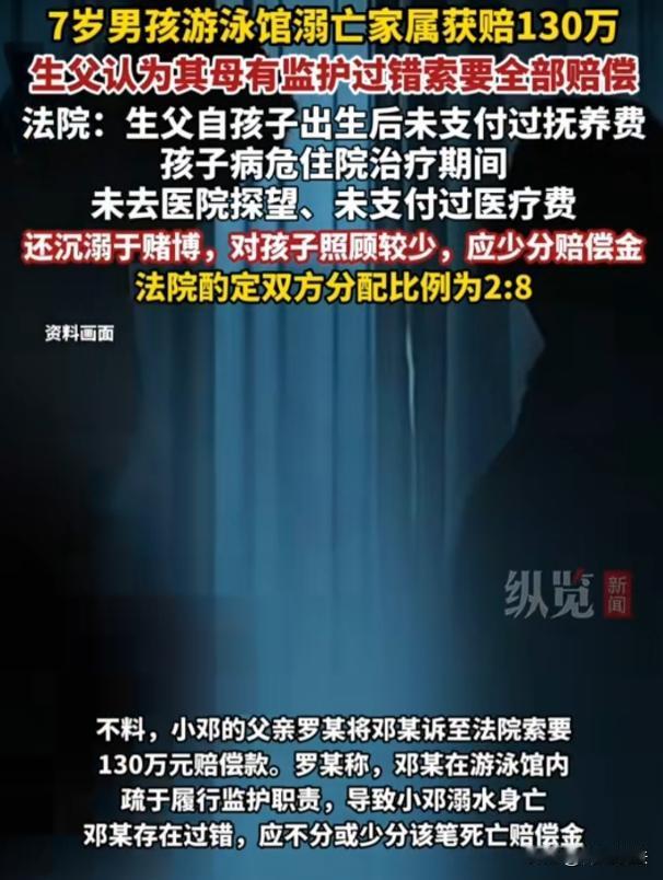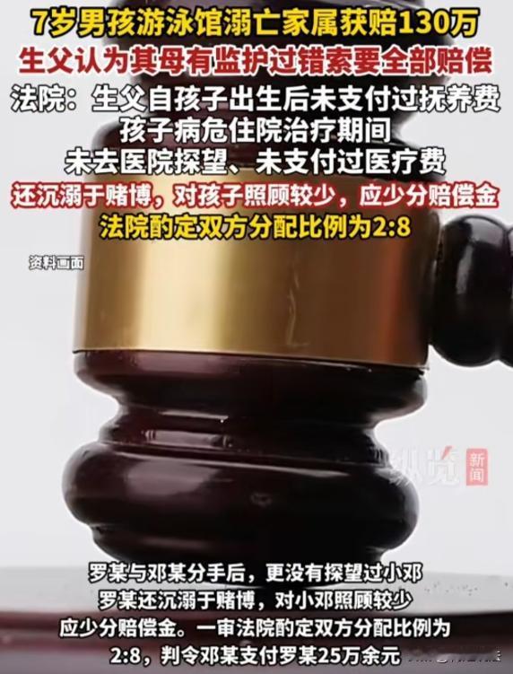 湖南衡阳,邓女士带7岁儿子小邓去游泳馆学游泳,期间因回复消息疏忽,儿子溺亡。游泳馆赔偿130万余元给邓女士。小邓生父罗某,从未尽过抚养义务,得知赔偿款后眼红,将邓女士告上法庭,称其未尽监护职责,索要全部或大部分赔偿金。邓女士拒绝,双方闹上法庭,法院这样判。 (来源:纵览新闻、极目新闻) 2024年8月,邓女士带7岁儿子小邓到游泳馆学游泳,本想好好陪孩子,却因回复工作消息疏忽,儿子溺亡。游泳馆赔了130万余元给邓女士。 小邓的生父罗某,和邓女士恋爱时没领证就有了孩子。 孩子出生后,罗某就像个甩手掌柜,压根没尽过抚养义务。 孩子一直由邓女士和外公外婆照顾,罗某连抚养费都没给过一分。 分手后,罗某更是彻底失联,邓女士后来才知道,他沉迷赌博,整天在赌场里混。 这游泳馆出了事,赔了130多万给邓女士。 这钱本来是给孩子的一点补偿,可罗某不知道从哪得到了消息,他看到这笔赔偿款,眼睛都直了,心里打起了小算盘。 罗某一纸诉状把邓女士告上了法庭,说邓女士没尽到监护职责,要求把赔偿金全部或者大部分给他。 邓女士怎么也没想到,这个从来没管过孩子的男人,居然还有脸来要赔偿金。 邓女士坚决不同意给罗某一分钱,孩子从出生到现在,罗某没尽过一天当父亲的责任,现在孩子没了,他倒想来分赔偿金,哪有这样的道理。 小邓的外公外婆也出具了声明,支持邓女士,说罗某没资格要这笔钱。 罗某觉得虽然自己没抚养孩子,但毕竟是孩子的生父,从法律上来说,他也有权利分这笔钱。 他还觉得自己没抚养孩子,是因为和邓女士感情不好,不是他的错。 可邓女士觉得罗某就是眼红这笔钱,想不劳而获。 这么多年来,她一个人辛苦抚养孩子,其中的艰辛只有她自己知道。 现在孩子没了,她心里的痛苦没人能体会,罗某不仅没有安慰她,还来抢赔偿金,实在是太过分了。 从法律角度讲,罗某作为生父,确实有权利分赔偿金,但应该考虑他没尽抚养义务的情况。 这笔赔偿金,到底该怎么分呢? 从法律上来说,这赔偿金虽然不是遗产,但属于近亲属共同共有。 也就是说,罗某和邓女士作为小邓的父母,都有权利分这笔钱。 但法律也讲究公平合理,不能一概而论。 罗某虽然是小邓的生父,但他从未抚养过孩子,没有尽到作为父亲的责任。 而邓女士长期抚养孩子,付出了大量的精力,在孩子溺亡这件事上,她也遭受了巨大的精神伤害。 依据《民法典》规定,对被继承人尽了主要扶养义务或者与被继承人共同生活的继承人,分配遗产时,可以多分。 有扶养能力和有扶养条件的继承人,不尽扶养义务的,分配遗产时,应当不分或者少分。 在这起案件里,虽然赔偿金不是遗产,但分配原则可以参照遗产分配。 罗某有抚养能力却从未抚养过孩子,没有尽到抚养义务。 而邓女士长期抚养孩子,对孩子尽了主要的抚养责任。 所以,在分配赔偿金时,罗某应该少分或者不分。 邓女士带娃游泳时疏忽导致孩子溺亡,这是不是会影响赔偿金的分配呢? 邓女士带娃游泳时回复消息疏忽,确实存在一定过失,但这是无心之失,和罗某故意不履行抚养义务有本质区别。 不能因为邓女士的这一点过失,就减少她在赔偿金分配中的份额。 罗某说自己没抚养孩子,是因为和邓女士感情不好,这能成为他少尽义务的理由吗? 《民法典》第一千零六十七条,它规定父母对未成年子女负有抚养、教育和保护的义务。 罗某和小邓是父子关系,可在小邓成长过程中,罗某从未给过抚养费,这明显没履行抚养义务,违反了这条法律规定。 感情不好,不能成为不尽抚养义务的借口,作为父母,对孩子有法定的抚养义务,不管和另一方感情如何,都不能逃避这个责任。 所以,罗某的理由不能成立。 《民法典》第一千一百八十一条规定,被侵权人死亡的,其近亲属有权请求侵权人承担侵权责任。 这里的近亲属,就包括父母。 罗某和邓女士作为小邓的父母,都有权分配赔偿金。 但罗某没尽抚养义务,邓女士长期抚养孩子,付出多,精神伤害也大。 虽然邓女士带娃游泳有过失,但和罗某故意不履行义务不同。 所以法院按2:8比例分配,二审维持原判,是合理合法的,既考虑了法律,也兼顾了实际情况。 最终,一审法院综合考虑各种因素,按照2:8的比例分配赔偿金,邓女士支付罗某25万余元。 罗某不服这个判决,上诉到了二审法院。 11月25日,二审法院维持了一审的判决结果。 有人认为: 罗某根本没资格要这笔赔偿金,他从来没管过孩子。 也有人说,从法律上他毕竟是生父,分一点也合理。 其实法律已经考虑得很全面了,既保护了尽抚养义务一方的权益,也兼顾了未尽义务方的一点权利。