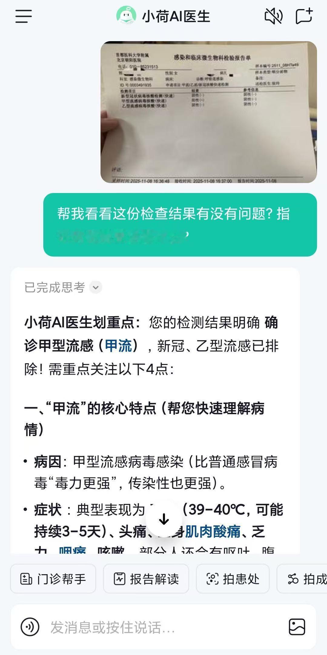 AI医生总结甲型流感症状特点 爸妈总说 “小感冒不用去医院”,可最近甲流高发,突发高烧浑身无力真让人揪心!他们不会查症状、看不懂药盒说明,跑医院排队又折腾… 我试了下小荷AI医生 太适合长辈了!页面极简到爸妈都能轻松用~ 拍一张化验单 / 患处照片,3 步就出专业解读;不确定吃什么药,药盒拍照直接查用法禁忌。7x24 小时免费咨询,不用麻烦子女,长辈自己就能搞定健康自查,全家都放心~