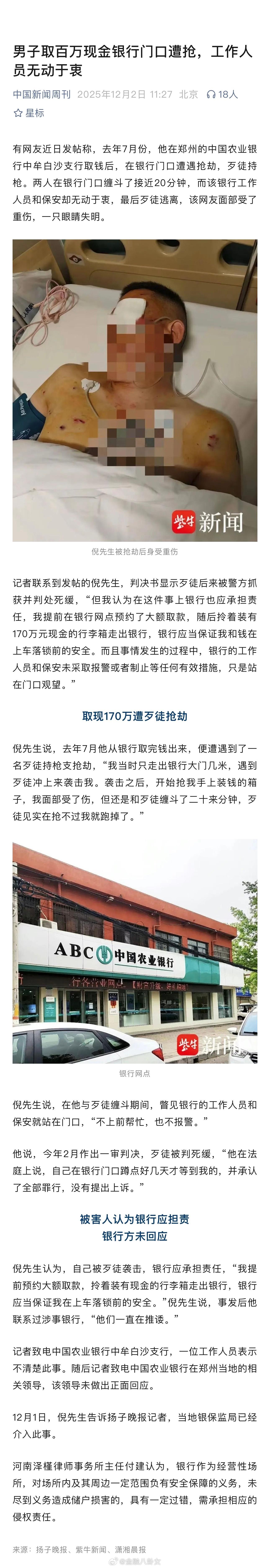 男子取百万现金银行门口遭抢,工作人员无动于衷男子取170万遭抢劫指责银行未施救
