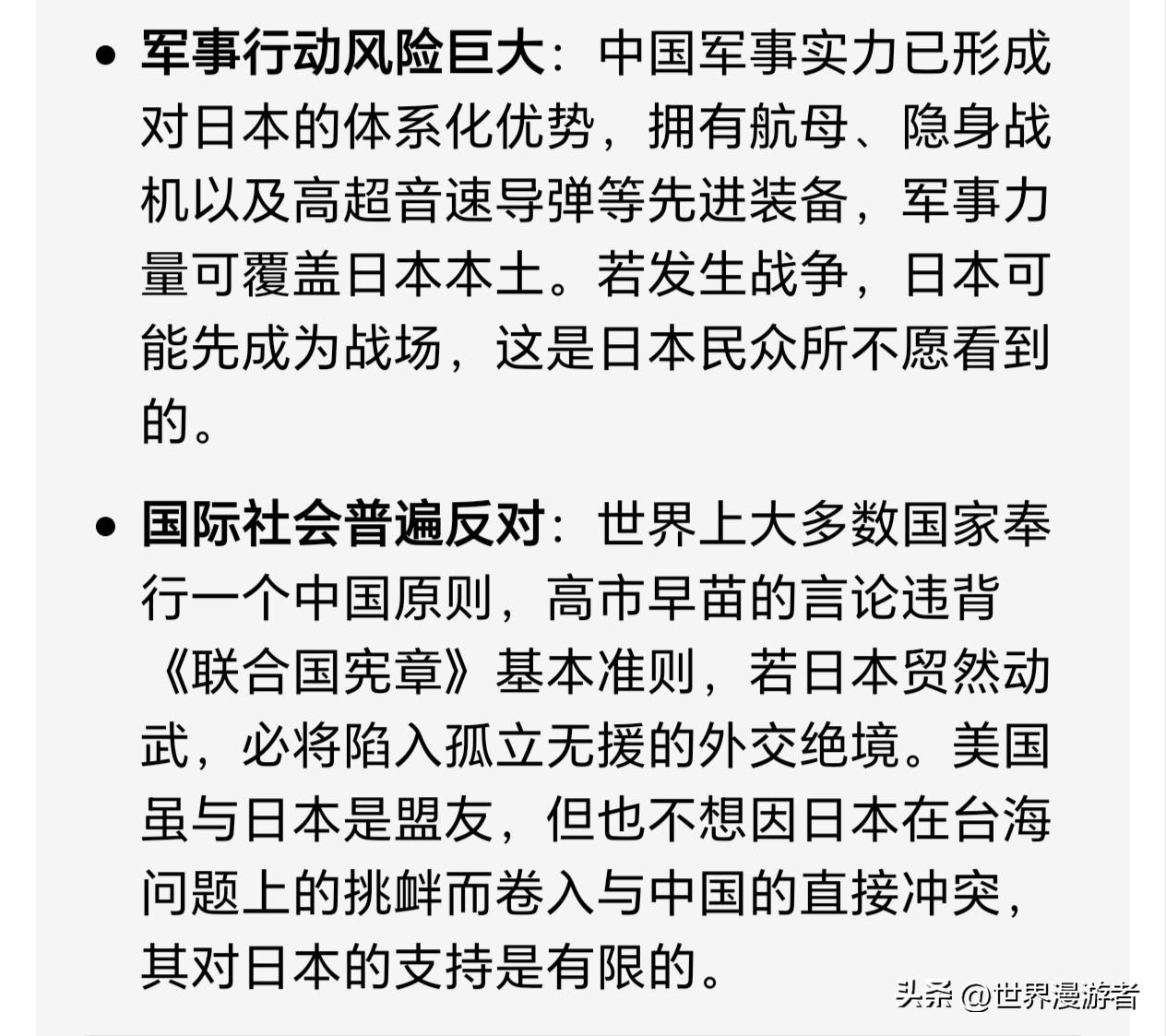 今天看了新闻,因为高市早苗的错误言论,导致了中日关系紧张。于是我就在想,会不会导致战争的爆发。 我就去问了ai会不会导致战争爆发?豆包给出的答案也与我想的一样吧。 虽然我们都恨日本人吧,大多数的人都对日本人有偏见,但是,仔细想一想,战争爆发对我们,对日本都没啥好处,最终受苦的都是无辜老百姓,日本的大多数人都像我们一样,都是平民老百姓,他们左右不了日本高层的决策,他们也是无辜的,有些日本民众也不希望爆发战争,是,日本是对我们中国造成了很多伤害,但是,我们不能一概而论,因为我们是中国人,我们是文明大国,不是野蛮生物。 我的意思是,对那些鼓动战争,做出对中国,对世界有伤害的人进行批评,进行指责,而不是一概而论的指责全部人,当然,我们也不能忘记历史,更不能忘记日本以前对中国的伤害,应该铭记于心。 虽说现在我们中国有实力应对,有底气,不惧怕任何来犯,但不费一兵一卒就能解决,那不是更好吗? 但如果日本还是决定一意孤行,到时候,就不要说我们中国欺负他们了。 希望战争不要爆发吧,也希望高市早苗及支持高市早苗的日本民众早点认识到错误,给中国道歉,并且撤回错误言论。 各位,如有觉得我说的不对的地方,多多包涵,也可以指出来,我好改正,谢谢!!高日早苗中国 战争 和平