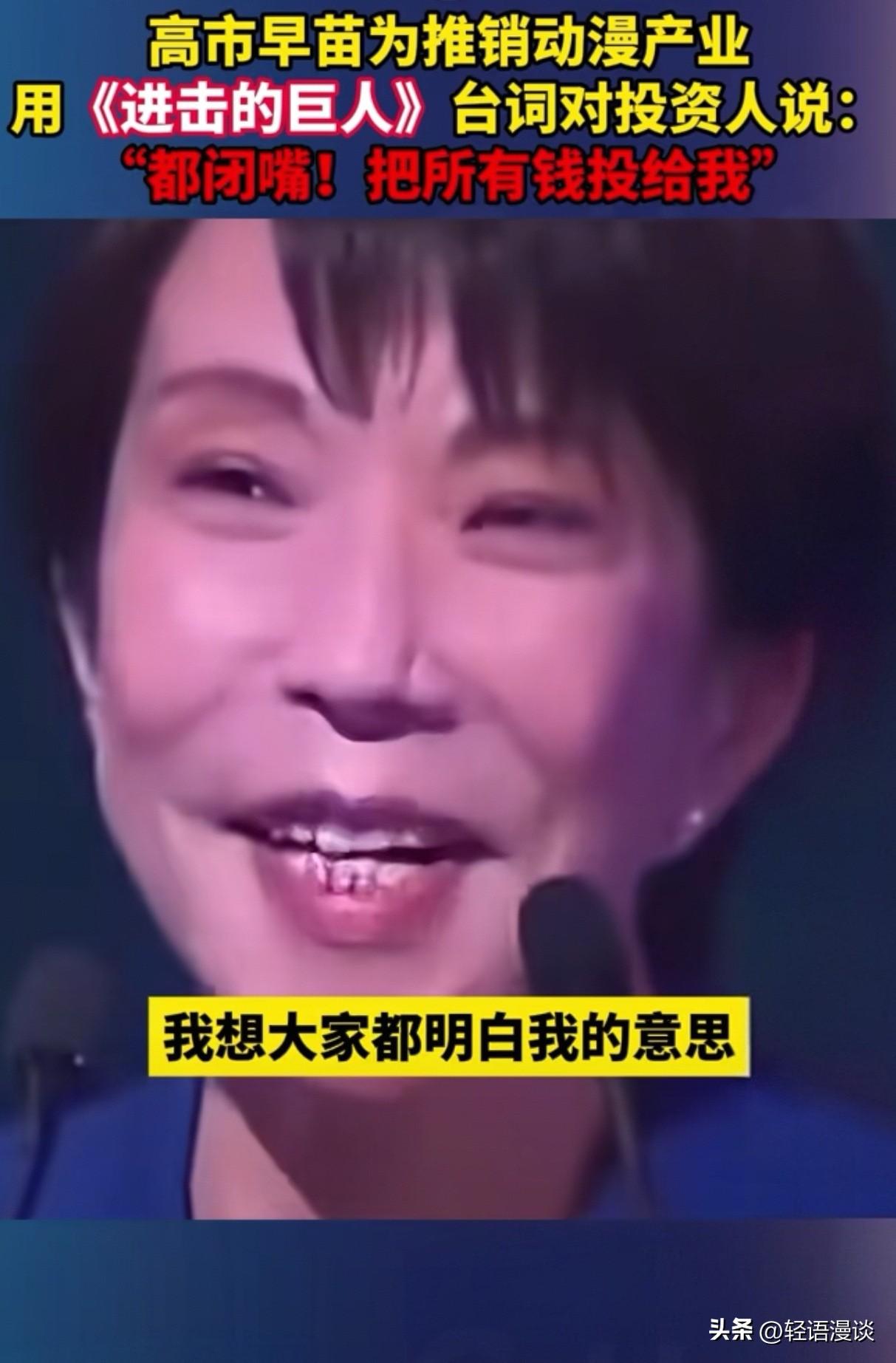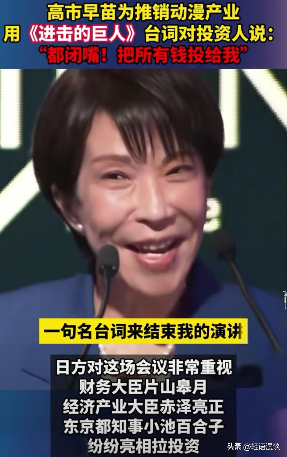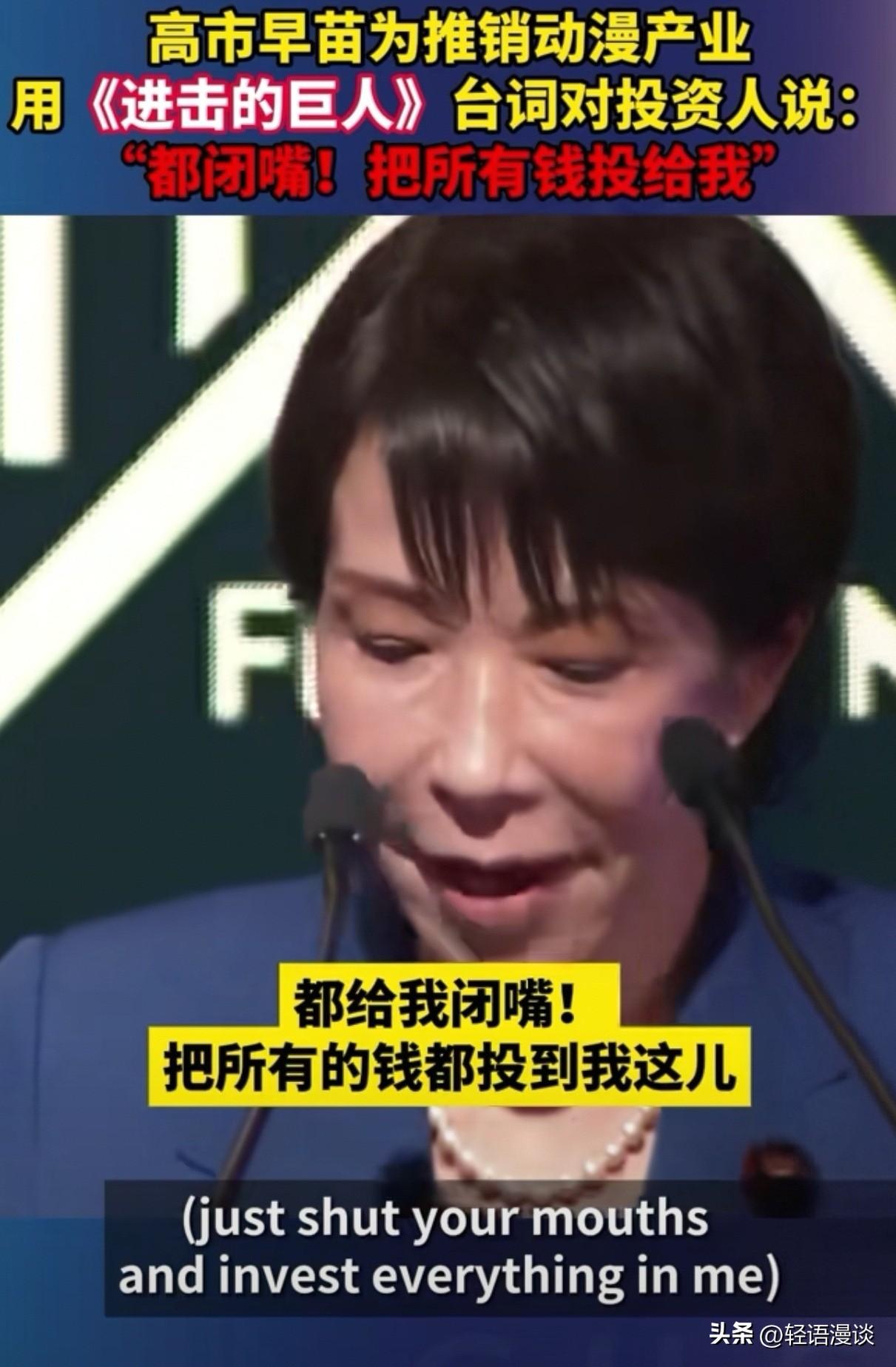 “画虎不成反类犬”。 前脚因不当言论砸了对华动漫饭碗, 后脚在沙特投资会甩动漫梗造势, 结果玩梗玩脱了。 东瀛高市早苗, 面对沙特投资人, 竟搬出《进击的巨人》中的台词: “都闭嘴!把所有钱投给我。” 一国首相哗众取宠的博眼球。 网友神补刀: “人狂必有祸,金主又不是无脑巨人。” 勇气可嘉,却恐令听众掩耳, 单靠一声吼,怕是唤不来真金白银。 所谓“祸从口出”,古人诚不我欺, 自己先画个饼充饥吧!