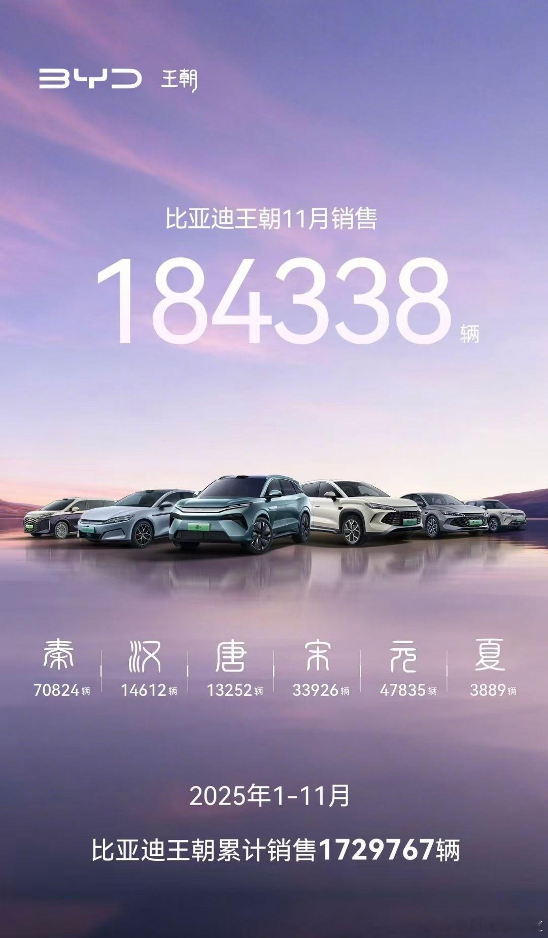 比亚迪 2025 年 11 月销量数据,480186 辆,海外 131661 辆。腾势 13225 辆,腾势 N8L 做到了 5443 辆,还不错。王朝网 184338 辆,秦 70824 辆,元 47835 辆,宋 33926 辆。方程豹 37045 辆,钛 7 直接来到了 24019 辆,原本是希望借着钛 7 站稳两万,结果钛 7 一个就突破两万。而且钛 3 和豹 5 也不错,分别是 6054 辆和 5569 辆。新能源汽车大v聊车