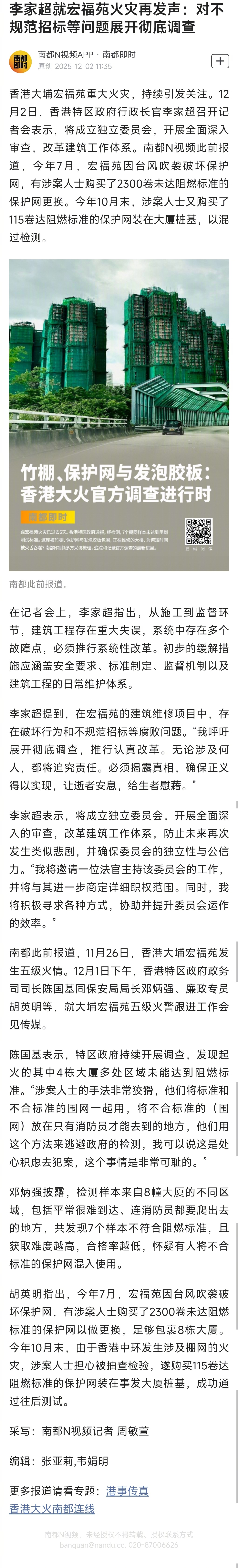 【#李家超就宏福苑火灾再发声#:对不规范招标等问题展开彻底调查】#香港火灾官方调查的焦点与进展#香港大埔宏福苑重大火灾,持续引发关注。12月2日,香港特区政府行政长官李家超召开记者会表示,将成立独立委员会,开展全面深入审查,改革建筑工作体系。南都N视频此前报道,今年7月,宏福苑因台风吹袭破坏保护网,有涉案人士购买了2300卷未达阻燃标准的保护网更换。今年10月末,涉案人士又购买了115卷达阻燃标准的保护网装在大厦桩基,以混过检测。在记者会上,李家超指出,从施工到监督环节,建筑工程存在重大失误,系统中存在多个故障点,必须推行系统性改革。初步的缓解措施应涵盖安全要求、标准制定、监督机制以及建筑工程的日常维护体系。李家超提到,在宏福苑的建筑维修项目中,存在破坏行为和不规范招标等腐败问题。“我呼吁展开彻底调查,推行认真改革。无论涉及何人,都将追究责任。必须揭露真相,确保正义得以实现,让逝者安息,给生者慰藉。”李家超表示,将成立独立委员会,开展全面深入的审查,改革建筑工作体系,防止未来再次发生类似悲剧,并确保委员会的独立性与公信力。“我将邀请一位法官主持该委员会的工作,并将与其进一步商定详细职权范围。同时,我将积极寻求各种方式,协助并提升委员会运作的效率。”