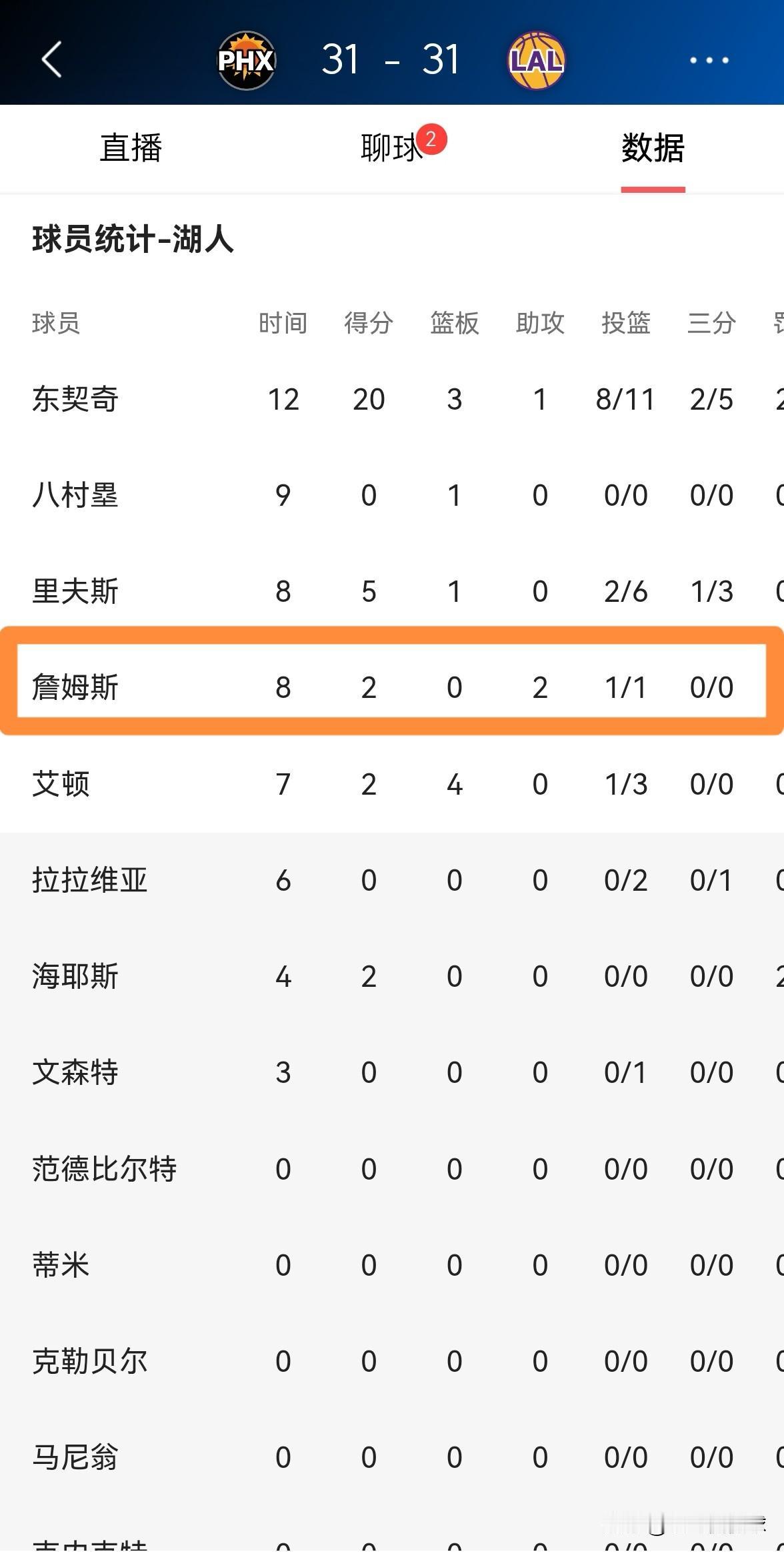 湖人超级巨星詹姆斯真是太喜欢当绿叶了!在今天进行的湖人和太阳的焦点战中,目前双方的第一节比赛已经结束,两队战成了31平。值得注意的是,在首节比赛中,詹姆斯毫无进攻欲望,他首发出战8分钟,投篮1中1得到2分,不过他的场上正负值为+3。 和东契奇的20分相比,詹姆斯的2分简直是不值一提,如今的詹姆斯已经彻底的成为了东契奇身旁的绿叶。