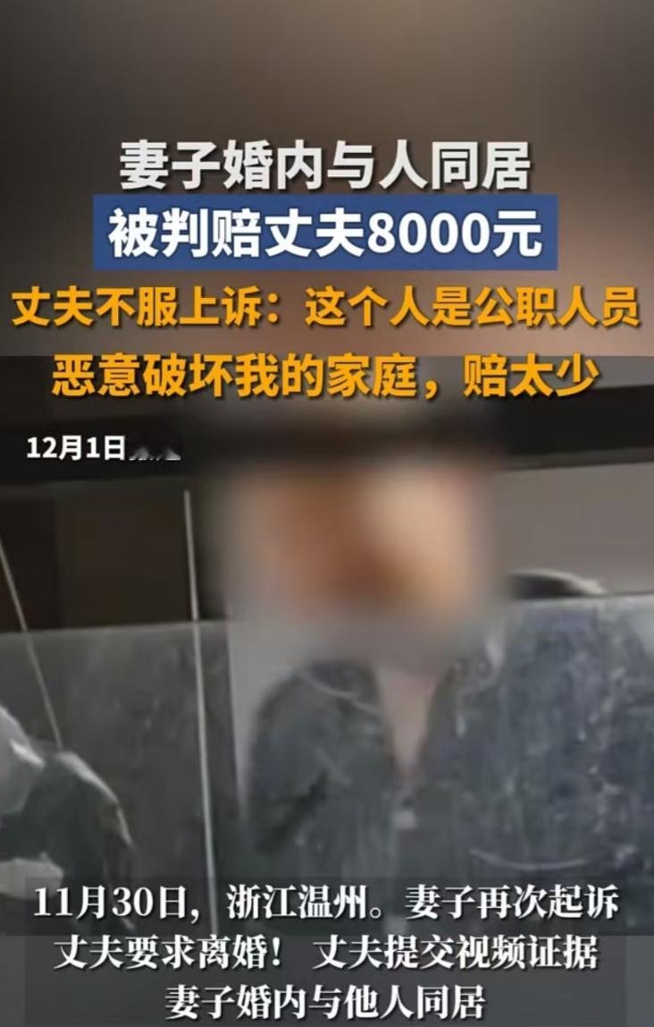温州,妻子不忠,被丈夫拍下证据后,她便提起了离婚。法院并没有判离婚,但随后两人分居,满一年后,妻子又再次提起离婚。丈夫要求赔偿,最终法院判决两人离婚,妻子赔偿丈夫8000元。谁知道丈夫觉得赔得太少了,不服判决提起上诉。丈夫觉得妻子的相好是一名公职人员,怎么样也该多赔偿自己一些,毕竟对方搞得自己家破人亡,这么一点钱,不可能了事。 在温州生活这么多年,蔡先生一直觉得日子就该是平平淡淡、稳稳当当的,他和妻子组建家庭后,虽说没大富大贵,但也算得上和睦,从没料到好好的日子会被一场背叛搅得支离破碎。 蔡先生是土生土长的温州人,平日里踏实过日子,对妻子也向来上心,可大概是日子久了,他渐渐察觉到妻子的变化,回家越来越晚话越来越少,对他也总是冷冰冰的,那种刻意的疏远,任谁都能感觉到不对劲,蔡先生心里犯嘀咕,却没立刻戳破只是悄悄留了心。 后来凭着男人的直觉,他找了机会跟着妻子,没想到真的拍下了她和别的男人在一起的证据,那些照片和视频,像一根刺扎进蔡先生心里,他以为妻子会有愧疚会解释,可万万没料到,妻子看到证据后,非但没有半分歉意,反而先一步提出了离婚,这事儿传到温州的亲戚朋友耳朵里,不少人都替蔡先生打抱不平,觉得他妻子做得太过分。 第一次去温州的法院,蔡先生心里憋着一股气,坚决不同意离婚,他想着好好的家不能就这么散了,就算过不下去,也不能让她这么痛快,法院看他态度坚决,也考虑到夫妻还有挽回的可能,最终没判离婚,可判决下来后两人的日子也没法再过了,就这么开始了分居。 在温州这座城市里,他们原本住同一个小区,分居后却成了最熟悉的陌生人,蔡先生一个人住着空荡荡的房子,心里不是滋味,这一年里两人没怎么联系,感情也彻底凉透了,等到分居满一年,妻子又一次向法院提起了离婚诉讼,这一次她的态度很坚决。 蔡先生知道,这段婚姻是真的没法挽回了,他唯一的要求就是让妻子为自己的不忠付出代价,赔偿他的损失,毕竟是妻子的背叛毁了这个家,他这些日子的委屈和痛苦,总得有个说法。可法院最终的判决,让蔡先生彻底寒了心,判决两人离婚,妻子只赔偿他 8000 块钱。 在温州现在物价可不低,8000 块钱说多不多,说少不少,可能也就够给家里换个家电,或者凑几个月的生活费,怎么能弥补一个家庭破碎带来的伤害? 蔡先生越想越不甘心,他打听清楚了,妻子外面的相好是个公职人员,按理说条件不错,怎么也该多赔偿自己一些,好好的家被他们搅得支离破碎,自己过得这么憋屈,对方却可能毫发无损,这 8000 块钱,实在太轻飘飘了。 身边有人劝他,离都离了拿到钱就算了,别再折腾了,可蔡先生心里的坎儿过不去,他觉得这不是钱的问题,是公道的问题。 他不服这个判决,很快就整理好了材料,向上一级法院提起了上诉,他想着就算上诉结果可能还是一样,就算要多花些时间和精力,也得争这口气 。那个公职人员破坏了他的家庭,总不能就这么轻易算了,总得让他们付出该有的代价,才能让自己心里稍微舒坦一点。 现在,蔡先生还在等着上诉的结果,在温州这座他生活了一辈子的城市里,这场离婚风波还没结束,他也知道可能最后还是没法拿到更多的赔偿,但他就是不想就这么妥协,毕竟家没了,要是连该有的公道都得不到,那这段日子受的委屈,就真的白受了。 (信息来源:北京时间,2025年12月1日)