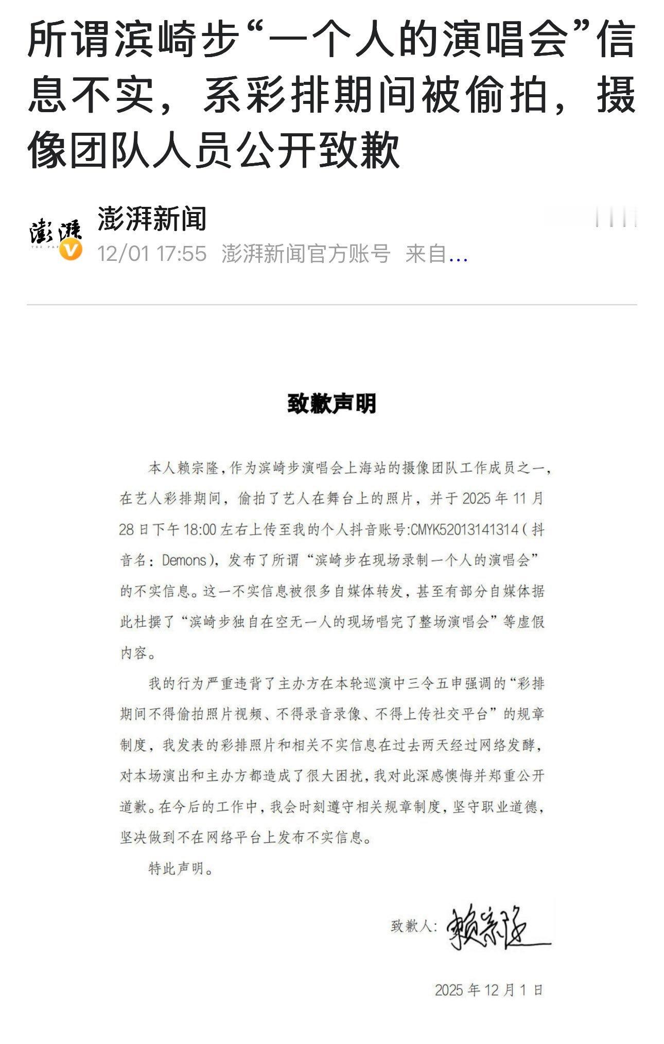 日本知名歌手滨崎步在上海个唱被取消、只能独自对着空会场开唱的照片,最近在网上引发大量关注。一名自称是滨崎步演唱会上海站的摄像团队工作成员之一的赖姓男子,星期一下午在微博发布了致歉声明,称相关信息不实,并指有关照片是他在滨崎步彩排期间偷拍的。