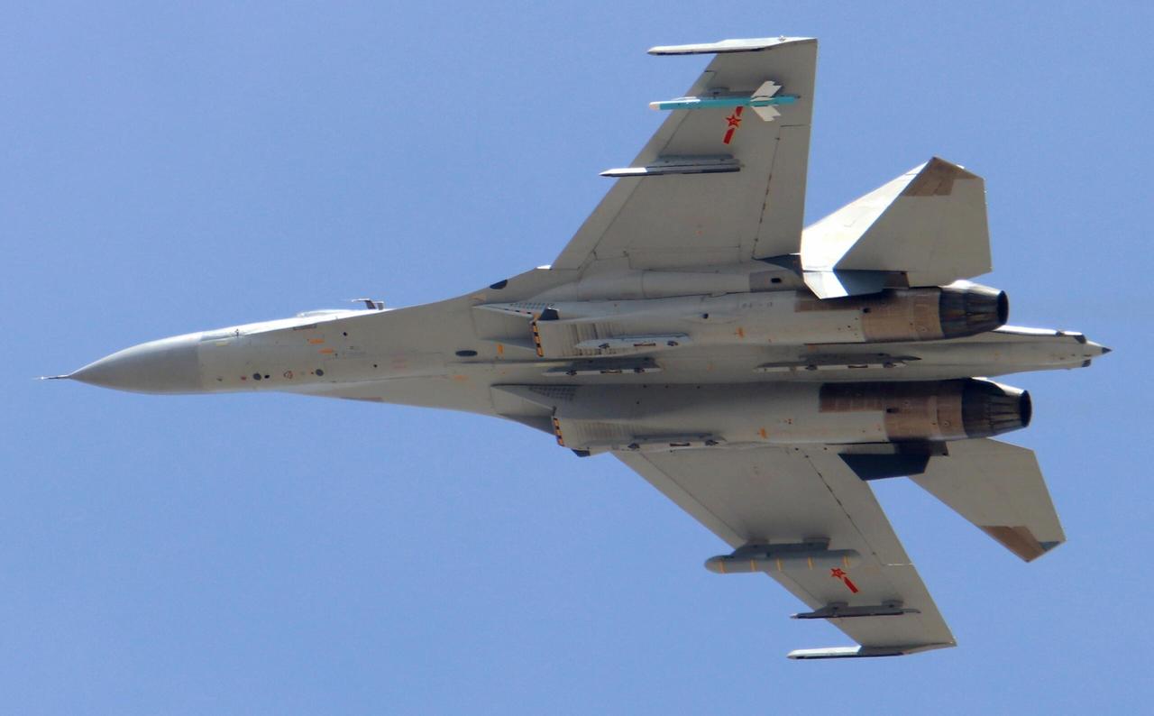 这是空军的歼-11BG,超级侧卫的最新改型之一,现在好像有一些给航空大学了,用于新飞行员教学训练,太奢侈了。注意在左右进气道的两侧,都有一个黑色的梯形天线,这是电子对抗用的告警天线。注意垂尾上黄色的机号,这是区分是否海军型的标志之一,另一个就是灰色的机身。