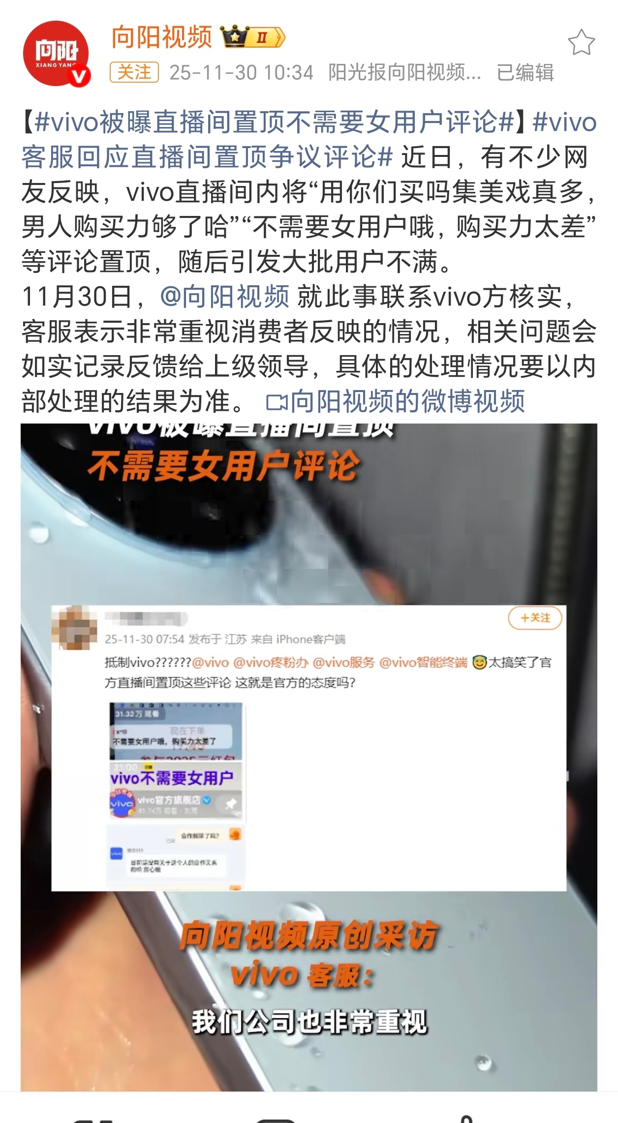 vivo被曝直播间置顶不需要女用户评论我这是错过了什么大瓜真置顶了这种言论?????