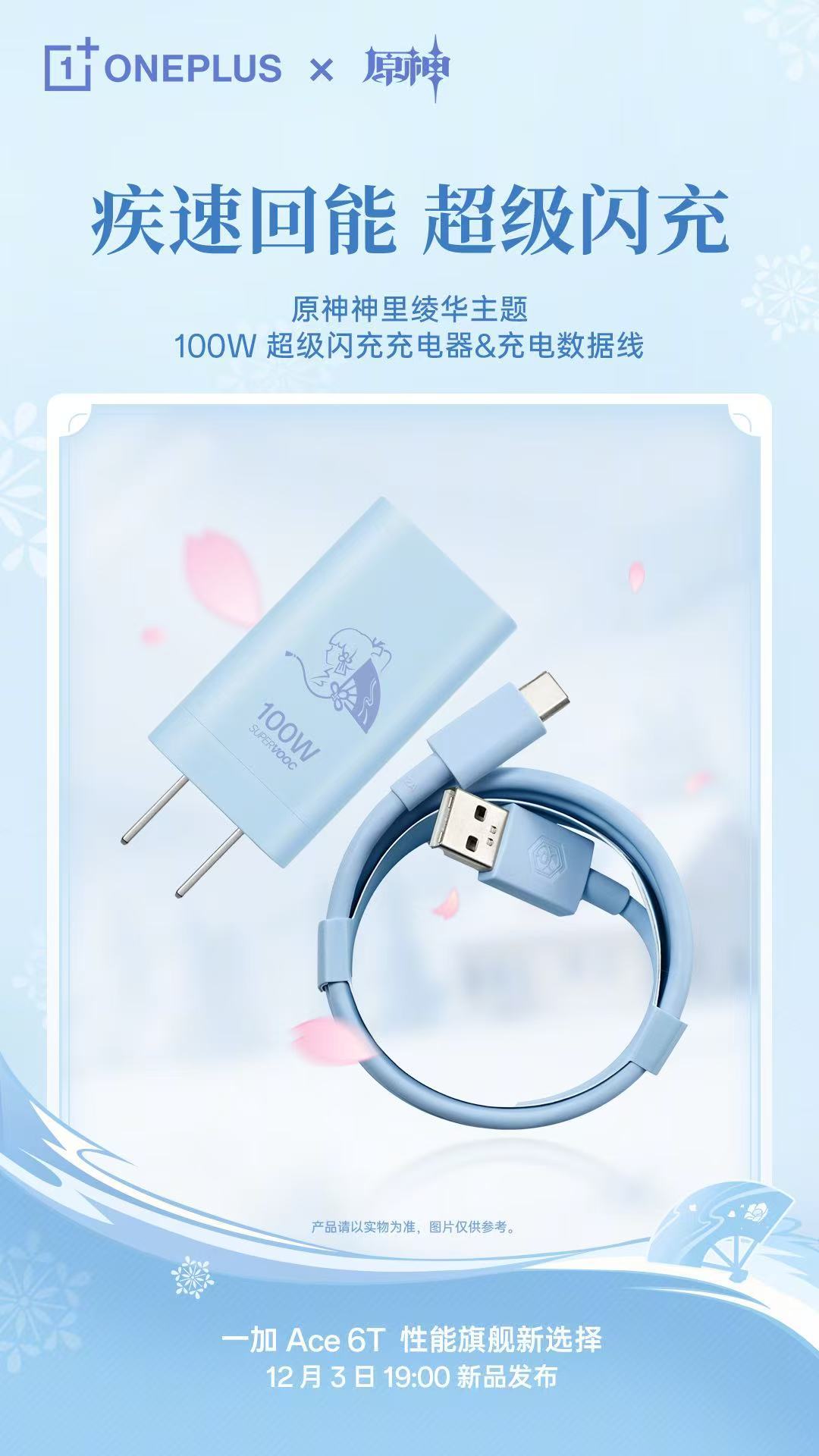 我勒个豆,原神党应该会超级喜欢这个吧一加Ace 6T原神定制版本,这个配件加配色,真的绝了,一加 Ace 6T 原神神里绫华定制机 即将优雅登场!采用原神神里绫华「雪霁蓝」限定配色,精心雕琢「白鹭公主」专属背板纹样,美貌而不失优雅!1️⃣ 100W 超级闪充充电器:神里绫华专属限定色,精致纹印,闪充充电超级快!2️⃣ 手机保护壳:神里绫华专属冰蓝氛围定制,独具匠心的替换卡片设计,自由选择出门搭配!3️⃣ 定制主题卡针:不锈钢材质结合光哑线雕工艺设计,高度还原雾切之回光!一加Ace6T 产品资讯,尽在明日 12 月 3 日